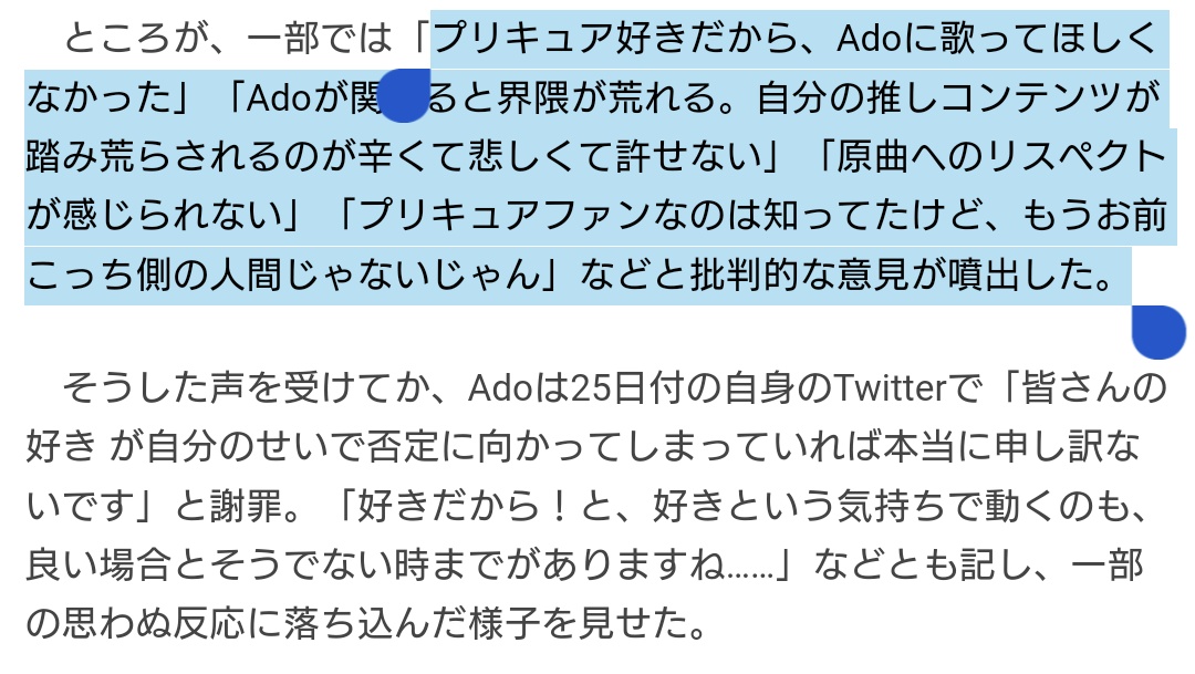 Adoアンチが「歌わないでとは言ったけど歌うなとは言ってない」というような言い訳したり、プリキュア製作陣がもしAdo起用を決めてたら白紙にとか、今回の炎上でプリキュアファンにとって需要がないかわかったはずと決めつけてた…。てか、内面批判だけでなく外見も何もかも中傷してて普通にドン引き…