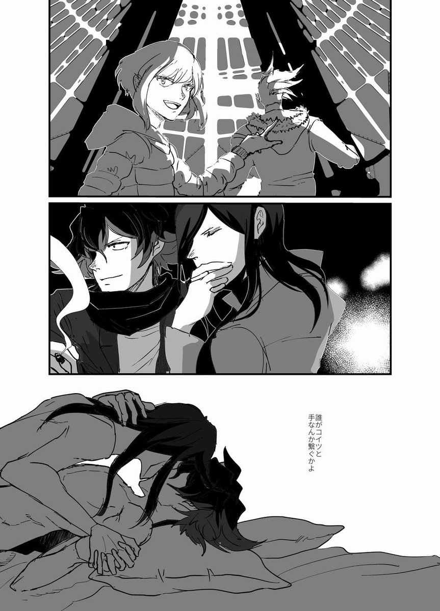 村の物資調達の為どっかの組織と取引する事になったマドバ…リの見た目が未成年で相手に怪しまれる可能性があるためゲをボスの代役にして、メとリはボスの愛人役として女装。美少女&美女に扮した2人を侍らせて交渉の場(多分クラブのvip室とか)に現れるゲ…みたいな妄想 を描いたやつ