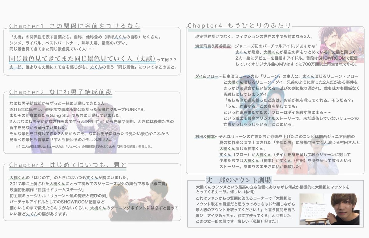 大橋くんの初めての映画、初めての外部舞台、初めての主演ミュージカル、初めてのSHOWROOM、最初で最後のデビュー……数えきれないほどの人生の大切な場面で隣(概念)にいた丈くんが大橋くんの初めてのキスシーンで隣(物理)に映り込んでるの面白すぎてダメ