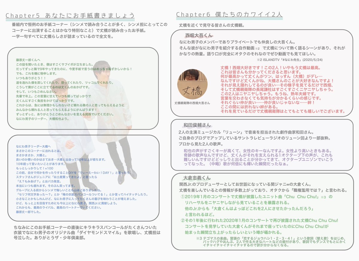 丈橋が花道で合流するときに大橋くんが後ろからついてくる丈くんを何回もニコニコ振り返ってたら、丈くんが大橋くんの頭をうちわでポンポンしながら抜かしていってめちゃくちゃ彼氏面だった