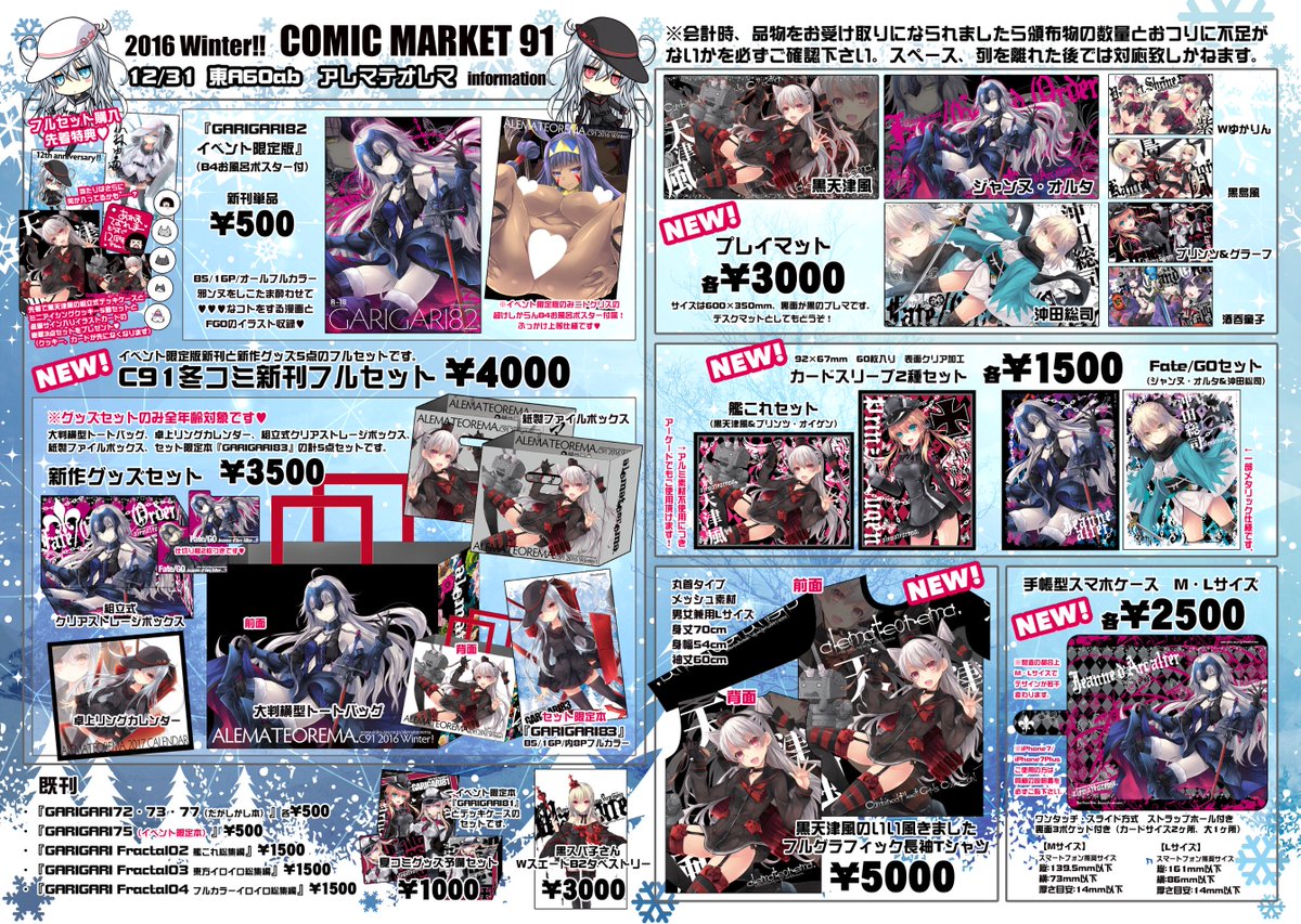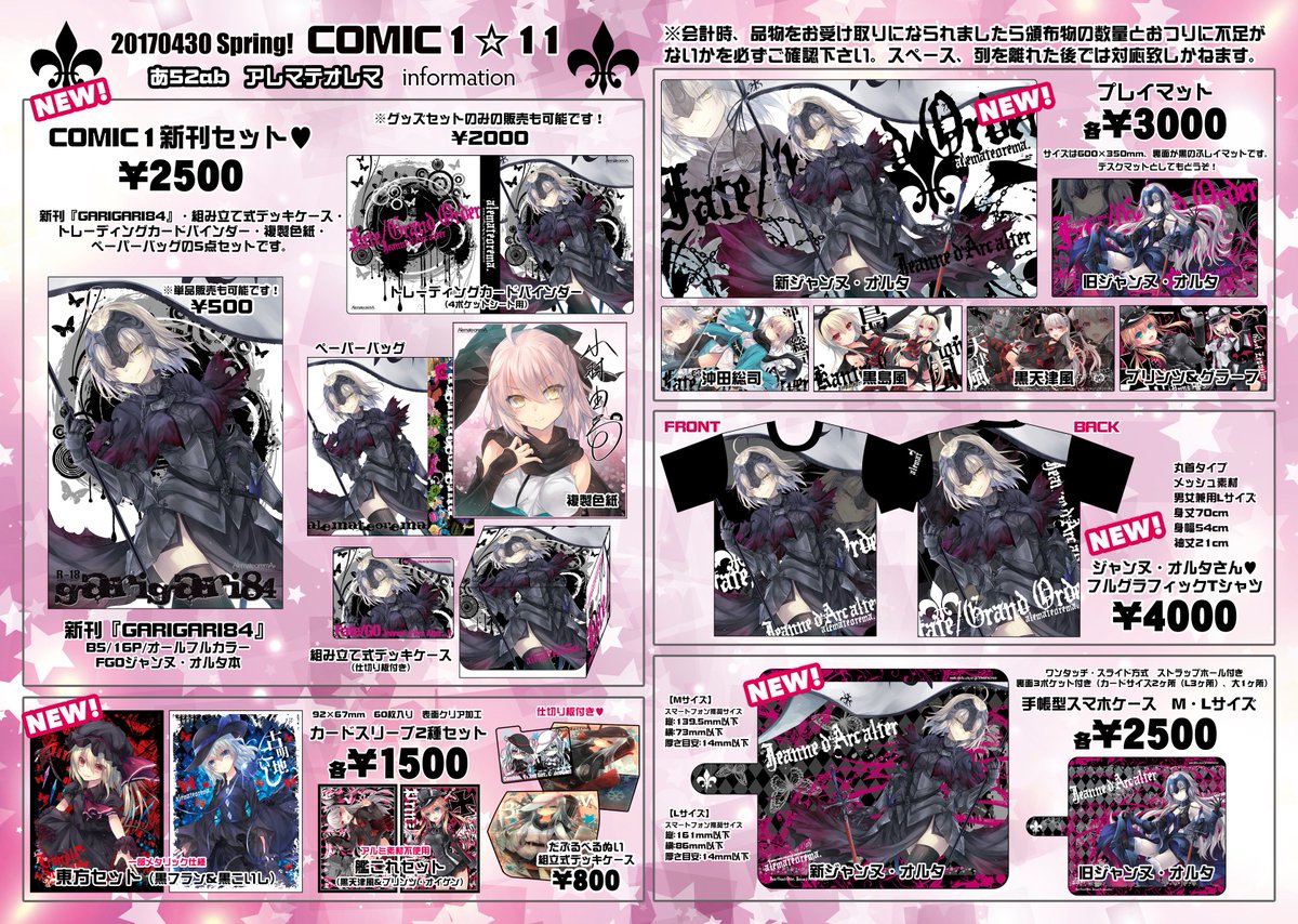4/30「COMIC1☆11」のお品書きを公開致します!FGOのジャンヌ・オルタ祭りでお待ちしております♪ 東方スリーブは先行販売です!当日はあ52ab「アレマテオレマ」でお待ちしております。またブログの諸注意も合わせて御覧下さい!alemateorema.blog83.fc2.com