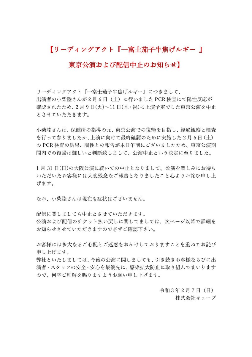 リーディングアクト『一富士茄子牛焦げルギー』につきまして、 昨夜公演後に、小柴陸さんが別作品に参加する為に PCR 検査を受けたところ、 本日陽性反応が確認されました。→
