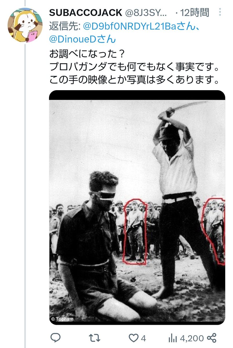おまえが貼ったその画像こそ「日本軍がそんなことするはずない。これは捏造写真だ」と反論するために作った右翼のプロパガンダだろ。オリジナルの写真と比較してみろ。同じやつなんか写っていない。 twitter.com/8J3SYXmbi4aHrM…