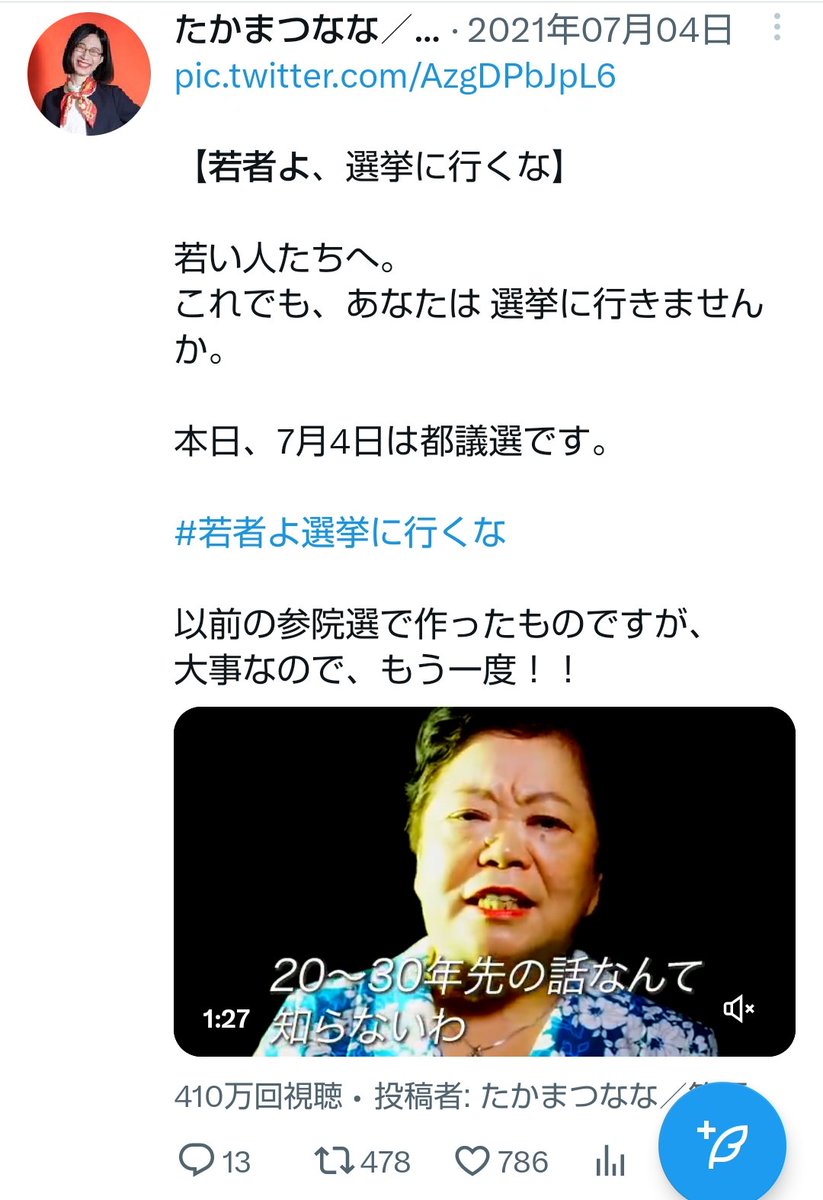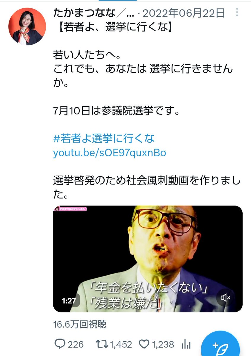 で、たかまつななの動画をよく見ると「若者はベーシックインカムを求めている。若者は憲法を変えようとしている。(愚劣な)高齢者はそれに反対している」という悪質な誘導をしている。ベーシックインカムも憲法改正も若者ではなく体制側が望んでいることだろうが…