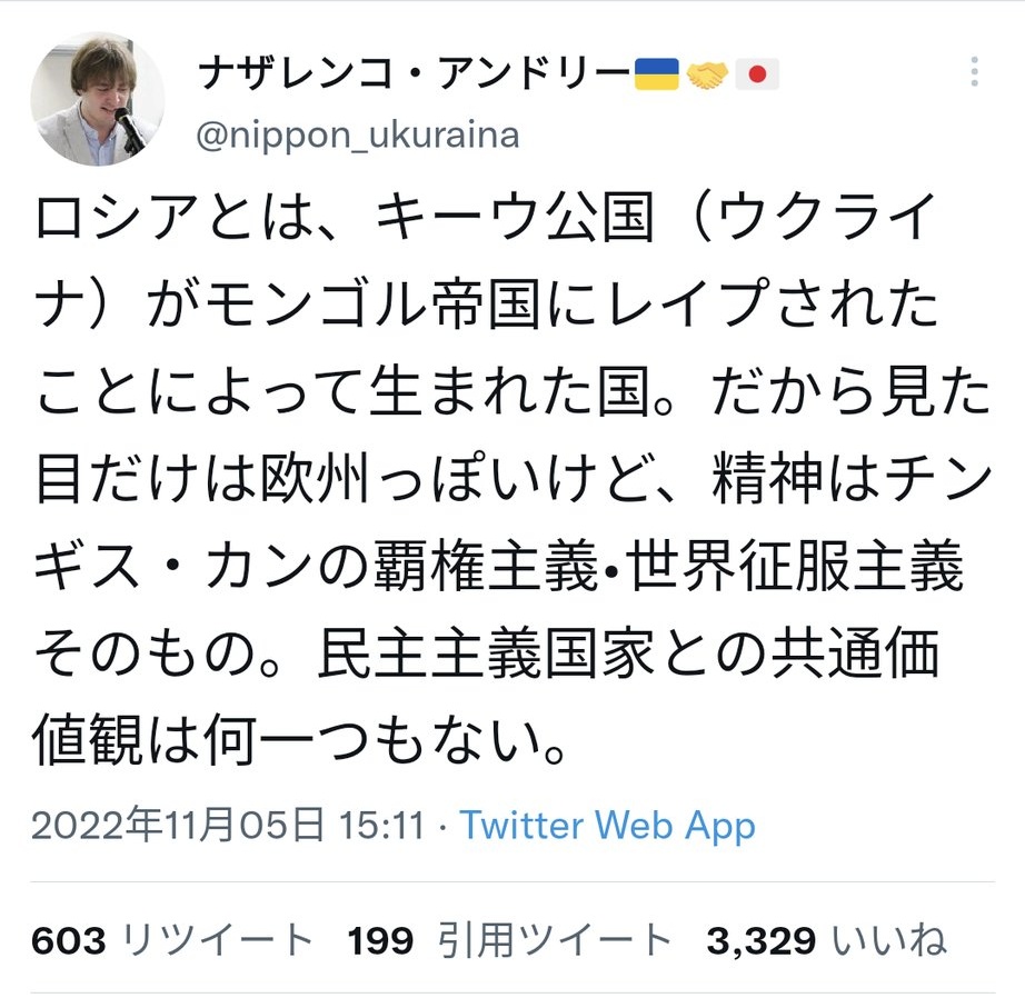 当然のことだが、ウクライナに極右や差別主義者がいるからといって、ロシアの軍事侵攻が正当化される根拠にはならない。そんなこと言ったら、日本にレイシストやネトウヨがいるからという理由で、日本が軍事侵攻されるのは当然という理屈になってしまう。