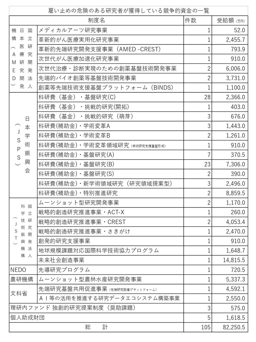 さらに、雇い止めの危険にある研究者のうち68人には来年度の競争的資金も配分が予定されています。その合計は105件、8億2250万5千円にのぼります。