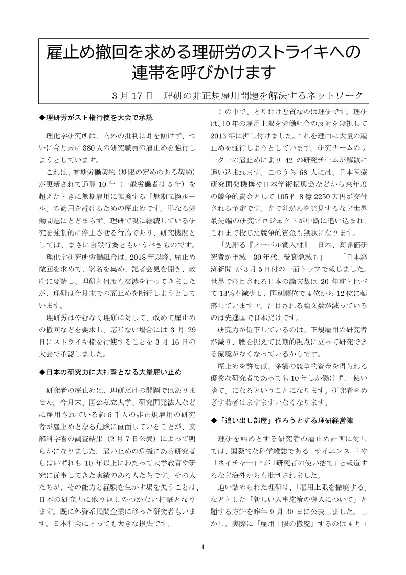理研の非正規雇用問題を解決するネットワークが、理研労が29日に雇い止め撤回を求めて、ストライキを構えていることに連帯する声明を発表しました。