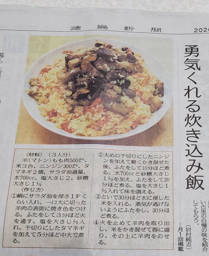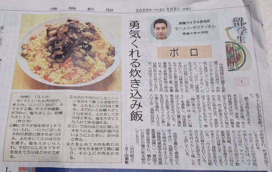 僕は料理が下手なので、いつも簡単な料理を作って食べてます。その中で一番好きなのは作り方がとてもシンプルの「ポロ」です。ポロはウイグルで行事の時欠かせない料理の一つです、旅行者にも好まれています。先日徳島新聞にインタビューさせていただきました。以下は新聞記事です。レシピもあります。