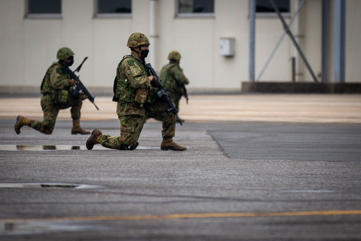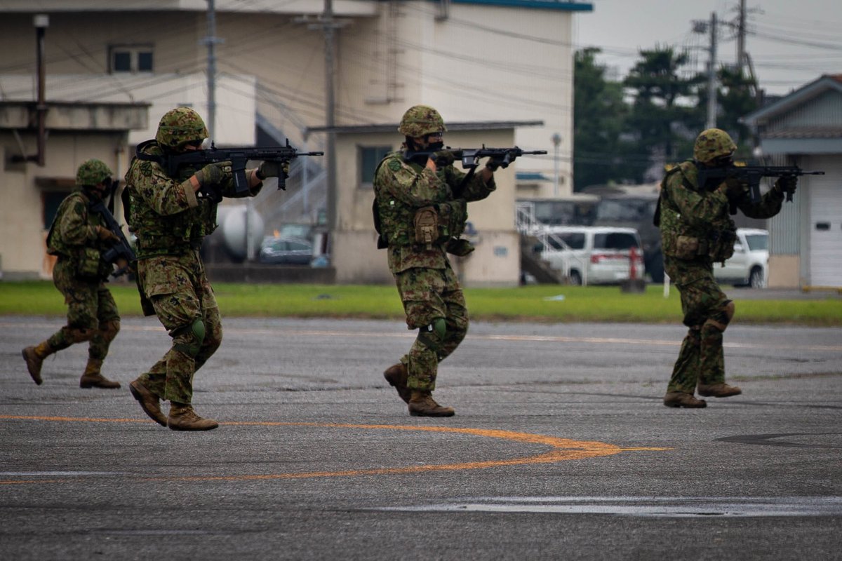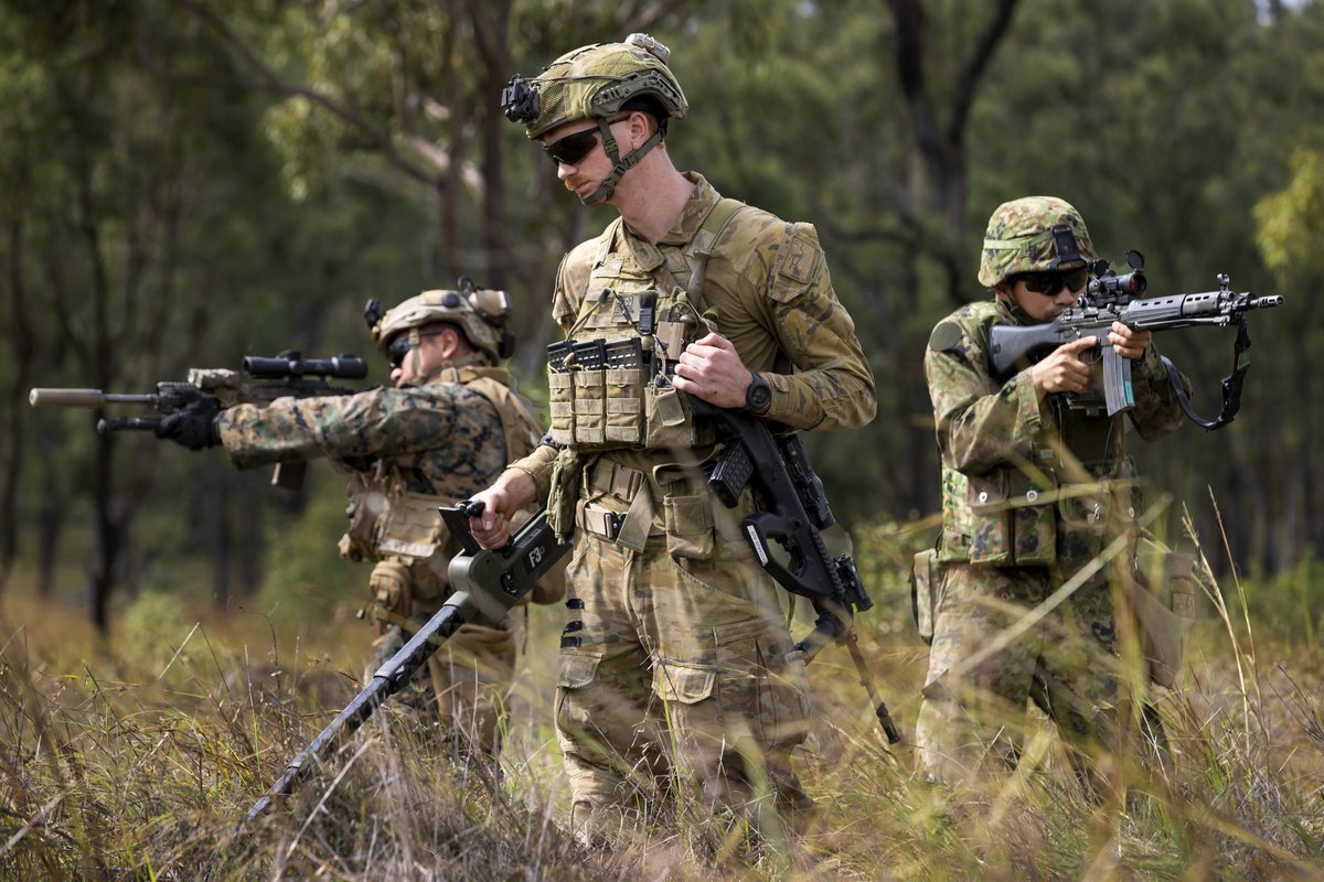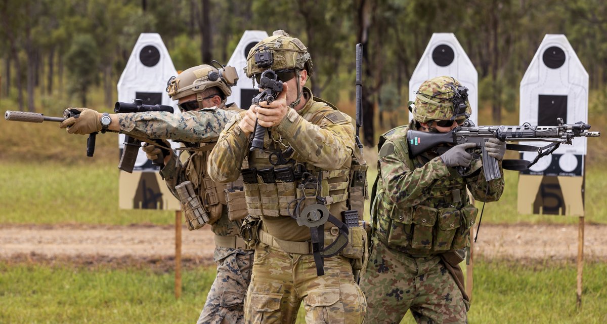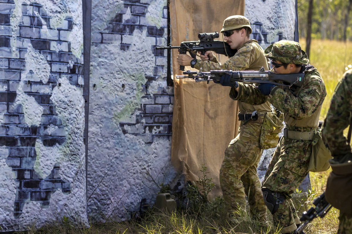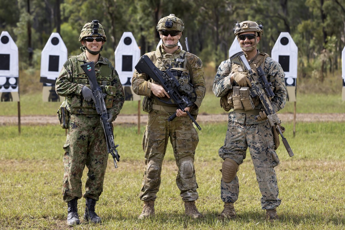 自衛隊とオーストラリアとアメリカ国の人が89式小銃とEF88とM27を持っています