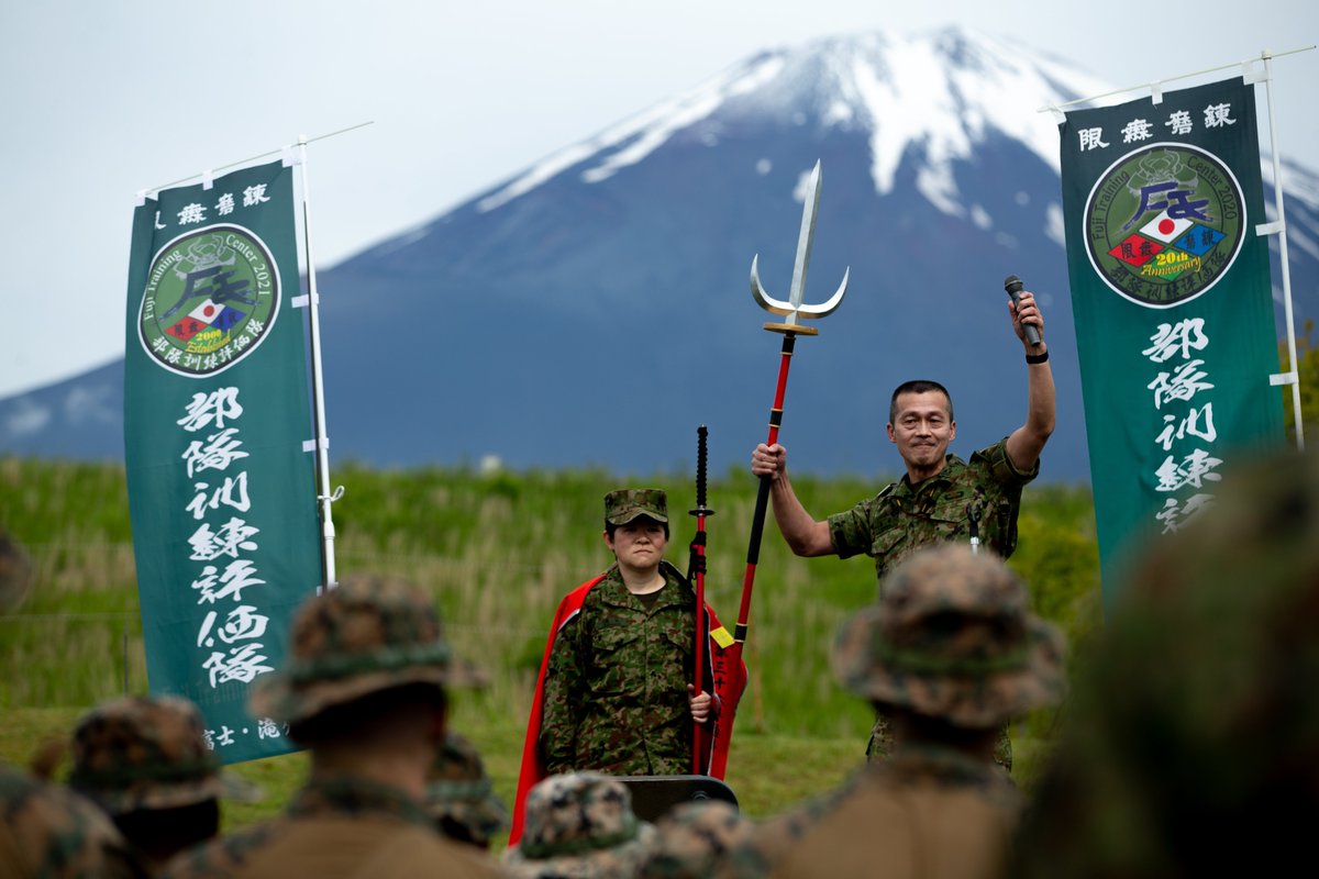 自衛隊の人が槍を持っています