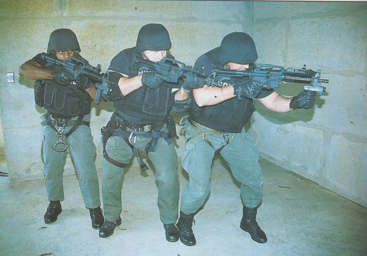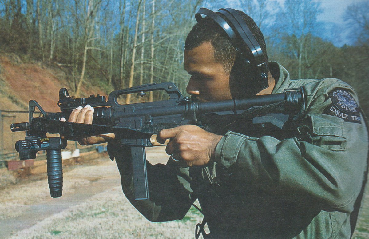 2000年代のアトランタ警察のSWATが持っているコルトSMGにグースネックマウントに載ったC-MOREのドットサイトとUITC Armaments Corp製のライトグリップが付いています