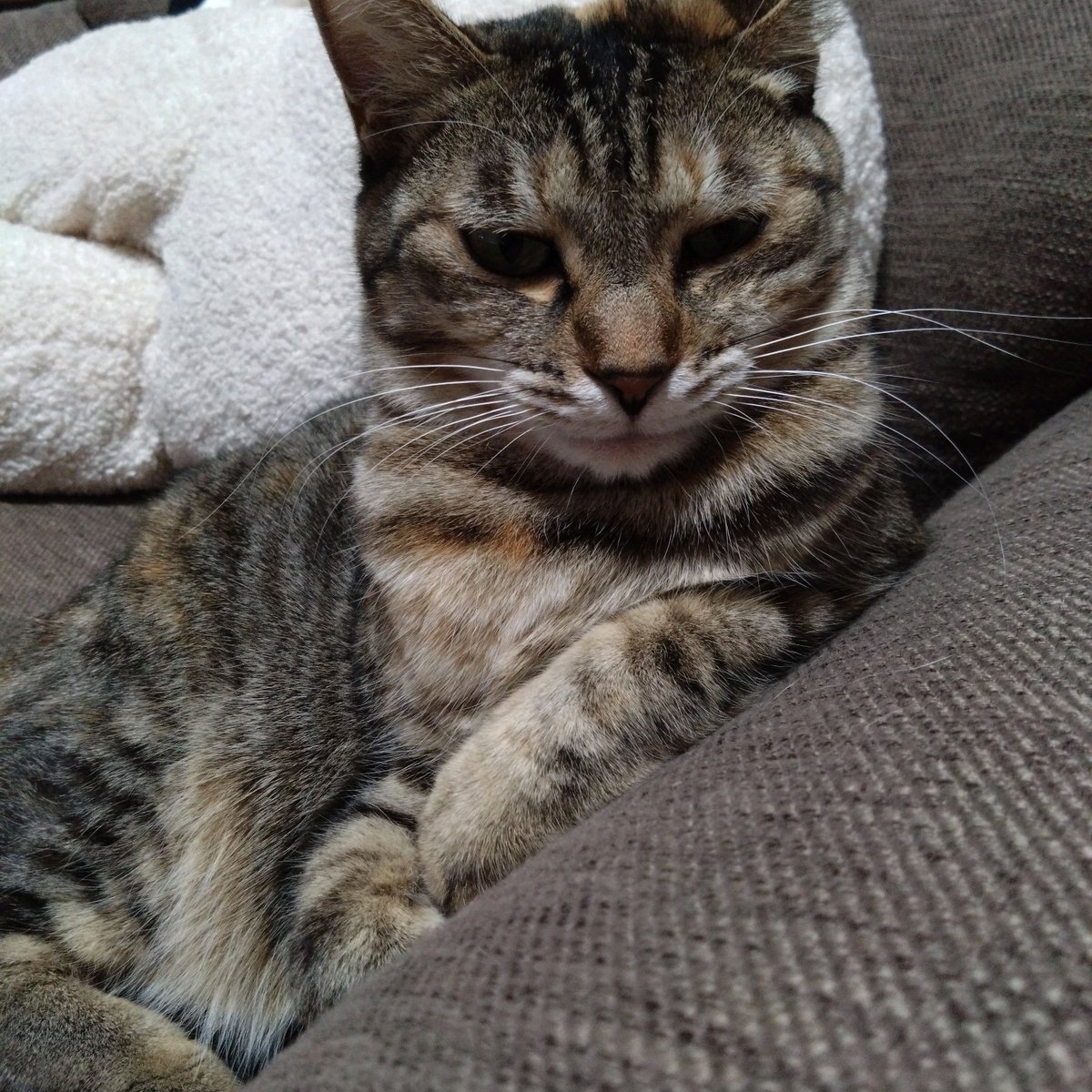 ニューネコチャン、2年弱野良で生活していたのに刺し身の中では一番最初たけえ鯛をしか食わないし、ヨーグルトもグルメファン以外見向きもしないし、コミュ力の高さでその辺の猫といい人といい誑かして貢がせてきたんだろうな。指名ナンバー1だよ。 見てよこの肘置きを使いこなしてる様子。
