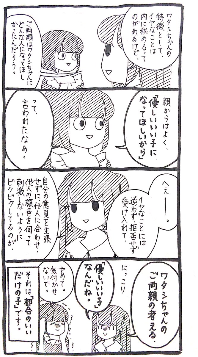 【ワタシ】優しいいい子とは。 3コマ目、「逆"ら"わず」でした。失礼。