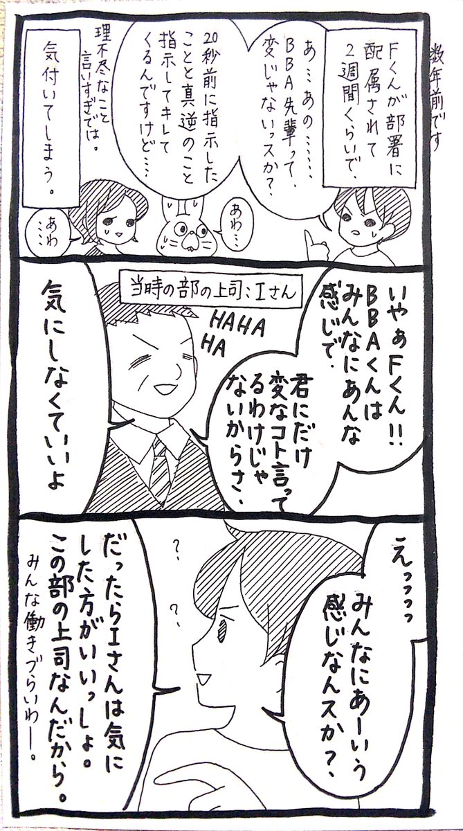 【うさぎ】Fくん「僕一人に対してなら僕の気にしすぎかもしんないから僕が改善すりゃいいけど、みんなになんだったらおかしいのはB●A先輩なんだから、上司として対策してしかるべきでは」