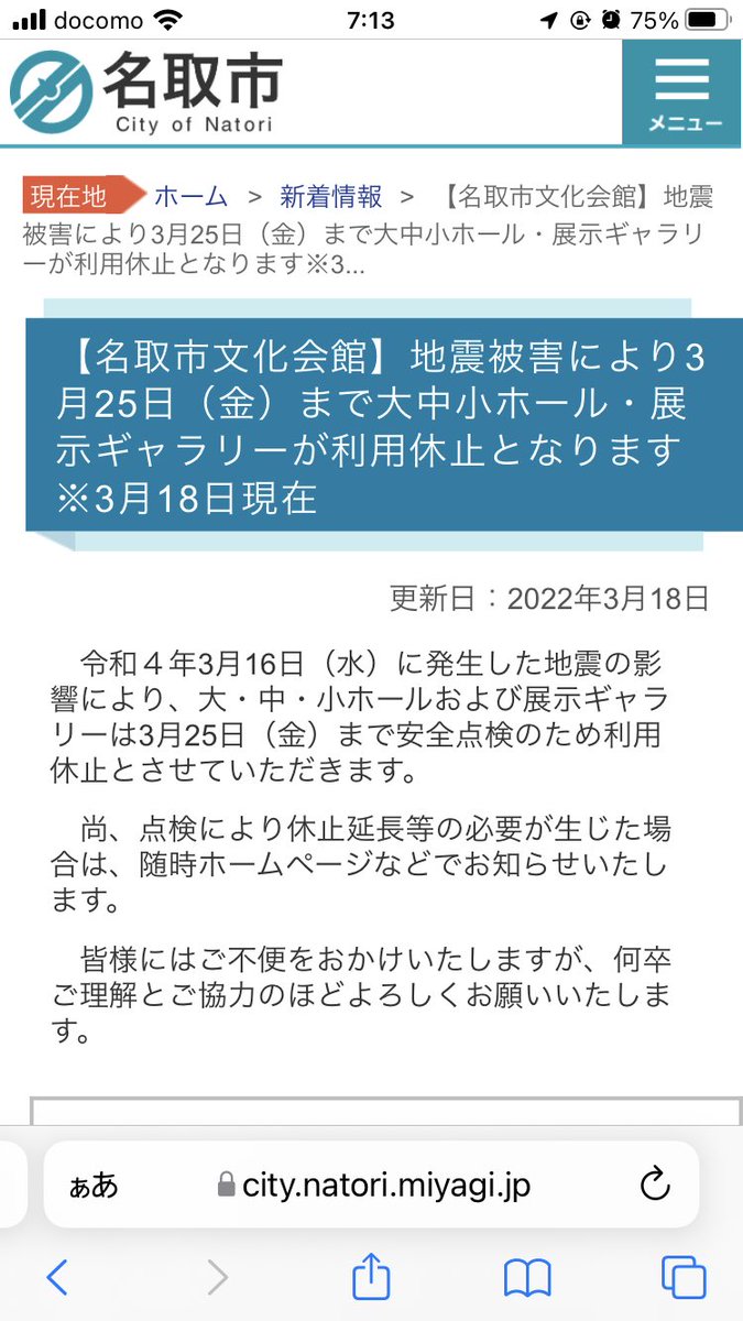3/19、今日の時点で「にっかり青江単騎出陣宮城公演」及び「石灯籠単基出没」の会場の名取市文化会館は、