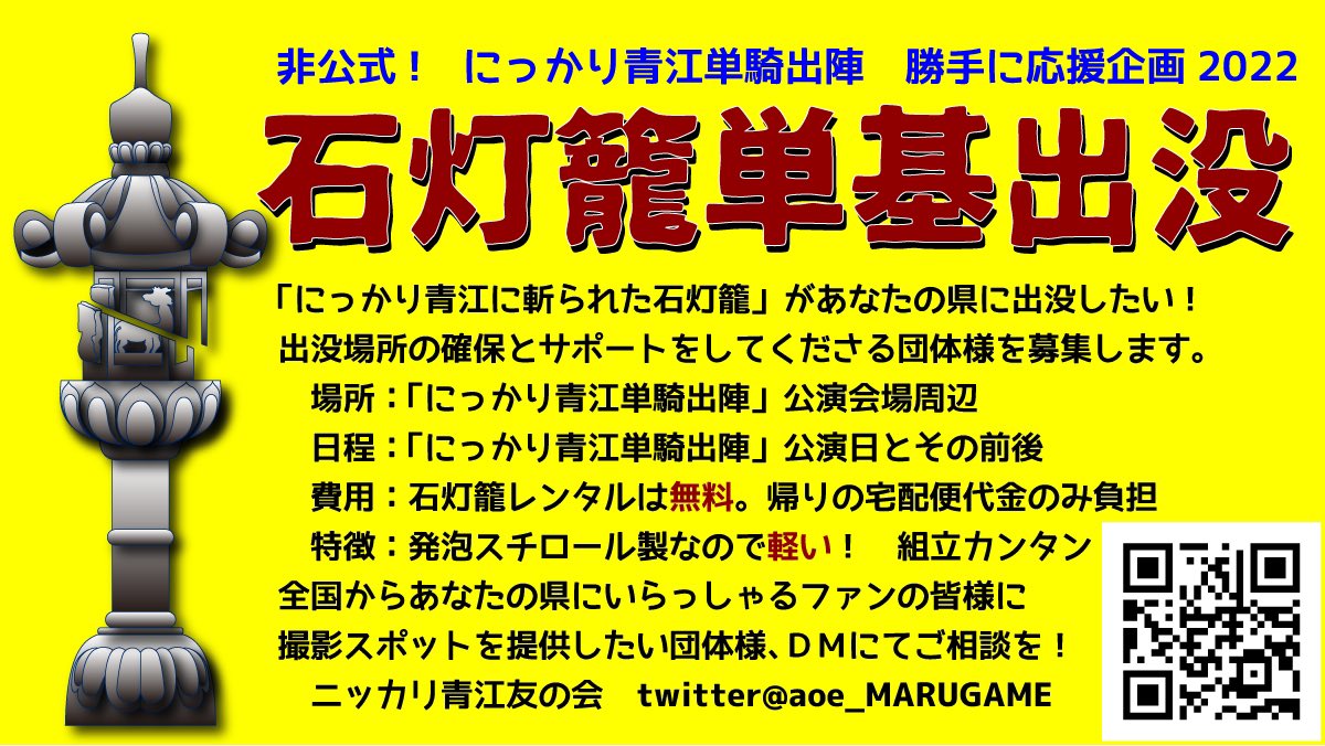 ニッカリ青江友の会では刀剣乱舞ミュージカル「にっかり青江単騎出陣」を勝手に応援するため日本全国での #ゲリラ石灯籠 を計画していましたが、感染症予防の観点から即座に断念。