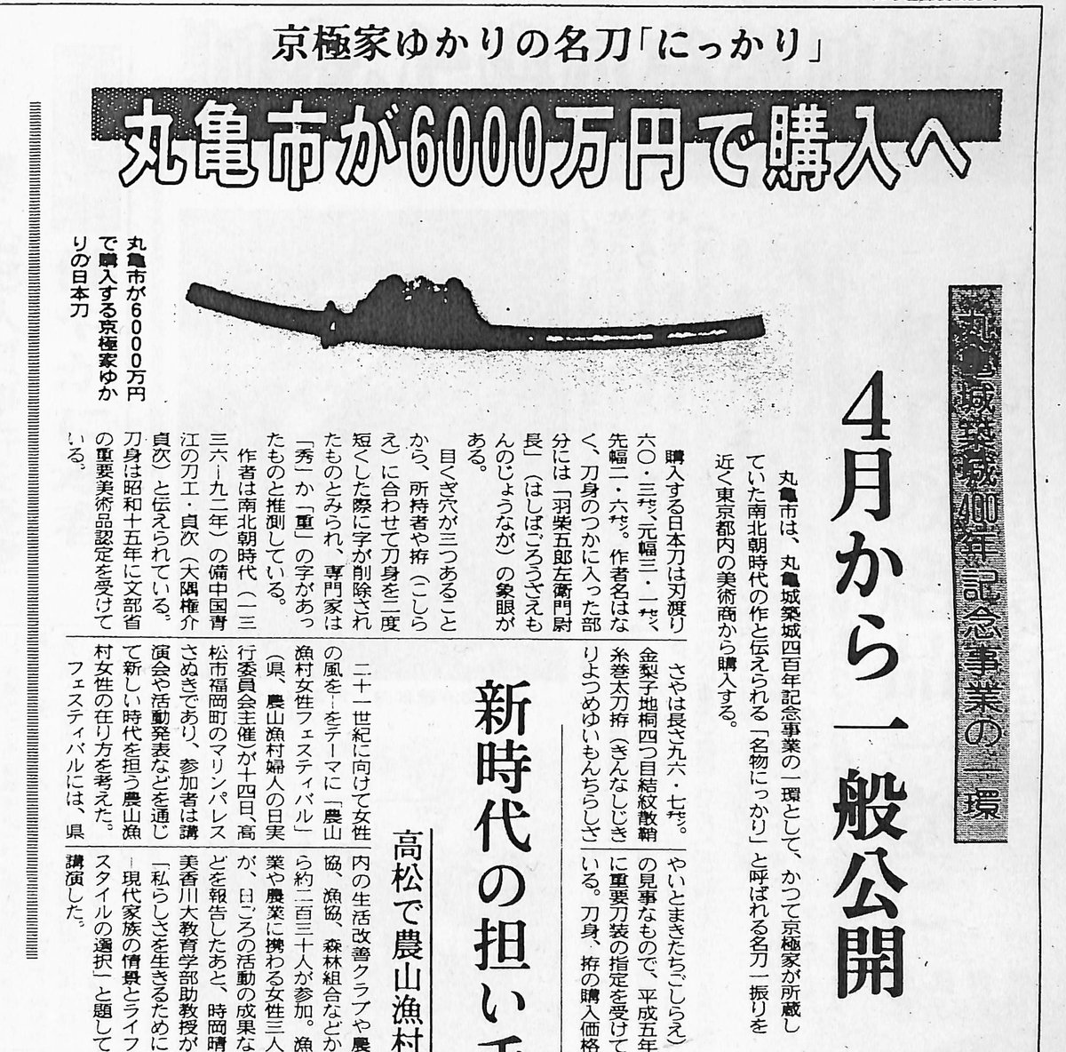 平成9年に丸亀市がニッカリ青江を購入した時の地元新聞の初出記事を発掘しました。