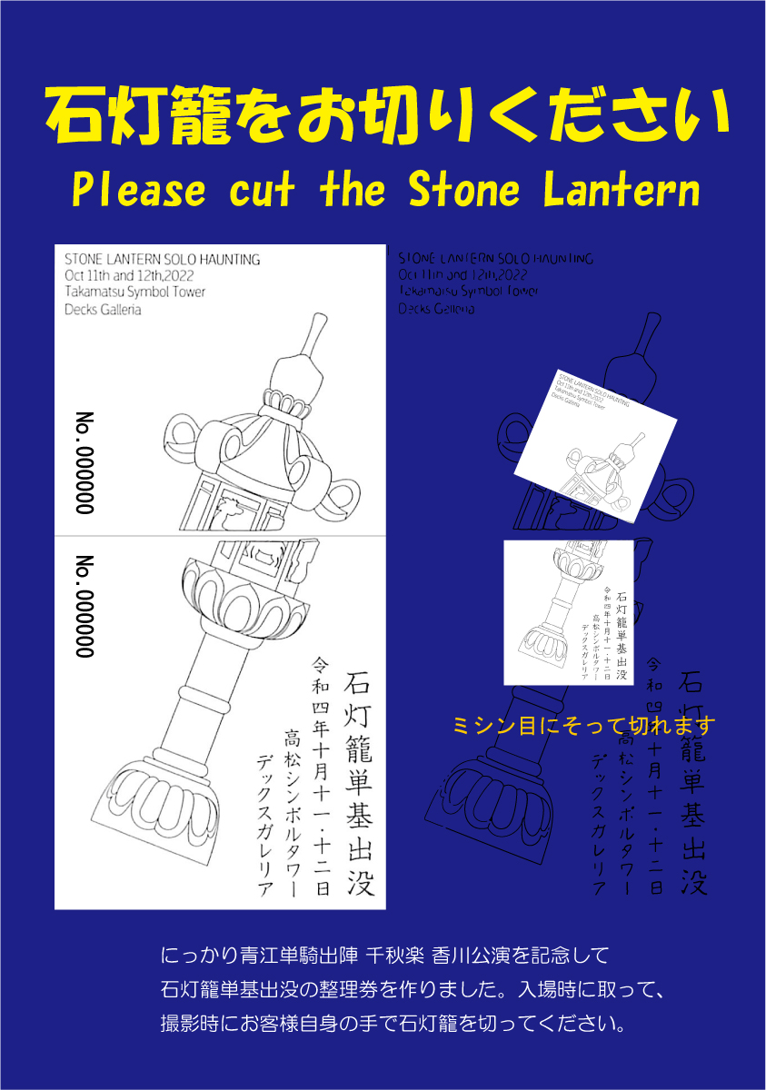 今回の出没は公演終も石灯籠を切っていただけるように二日とも夜10時まで石灯籠が「高松シンボルタワー」に出没します。