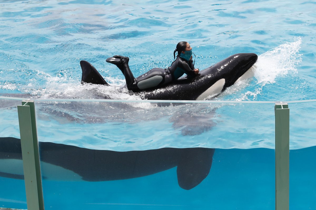 パフォーマンスの直前にトレーナーを見つけ、顔を上げて目で追いかけるシャチの姿は何度みても可愛いですね。