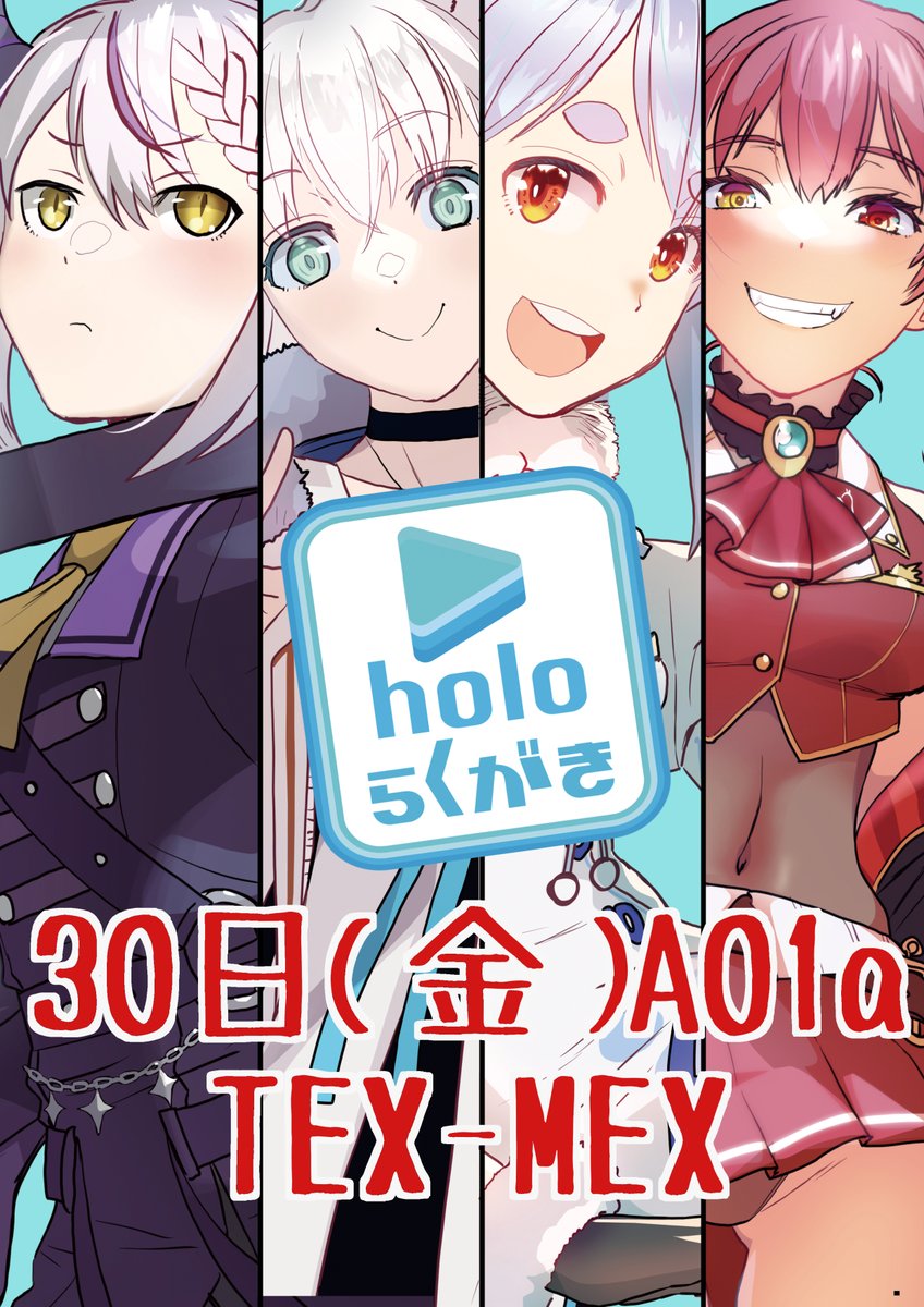 と言うわけで冬告知。一日目(金曜日)A01aTEX-MEXでお待ちしております。ホロライブのカラーラクガキ本です。会場ですと500円です。とらecs.toranoana.jp/tora/ec/item/0…だと手間はありませんが少し割高です。それと、限定200個で「ホテル・モスクワ」のタンブラーも作りましたのでぜひぜひ