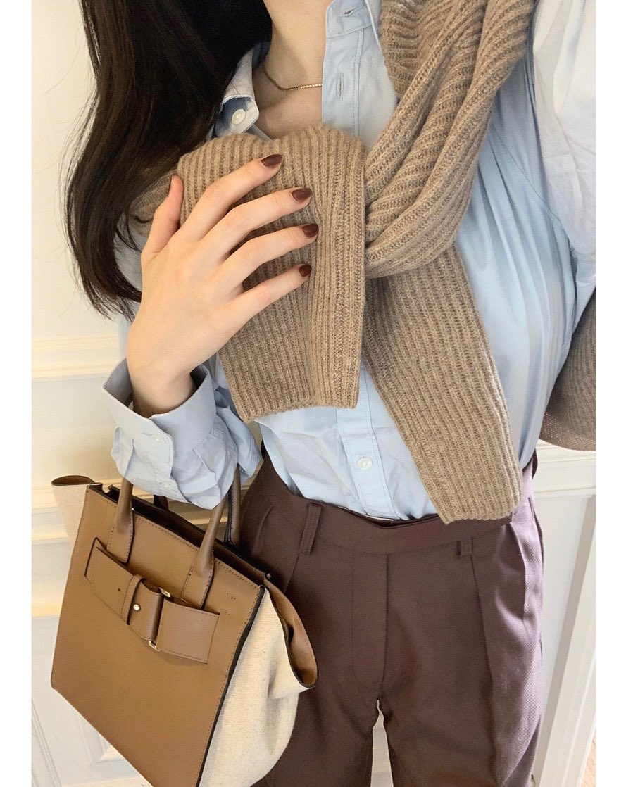 私はこっくりしたブラウンのスラックスに淡いブルーのシャツを合わせて秋っぽくコーデ組んでみました。