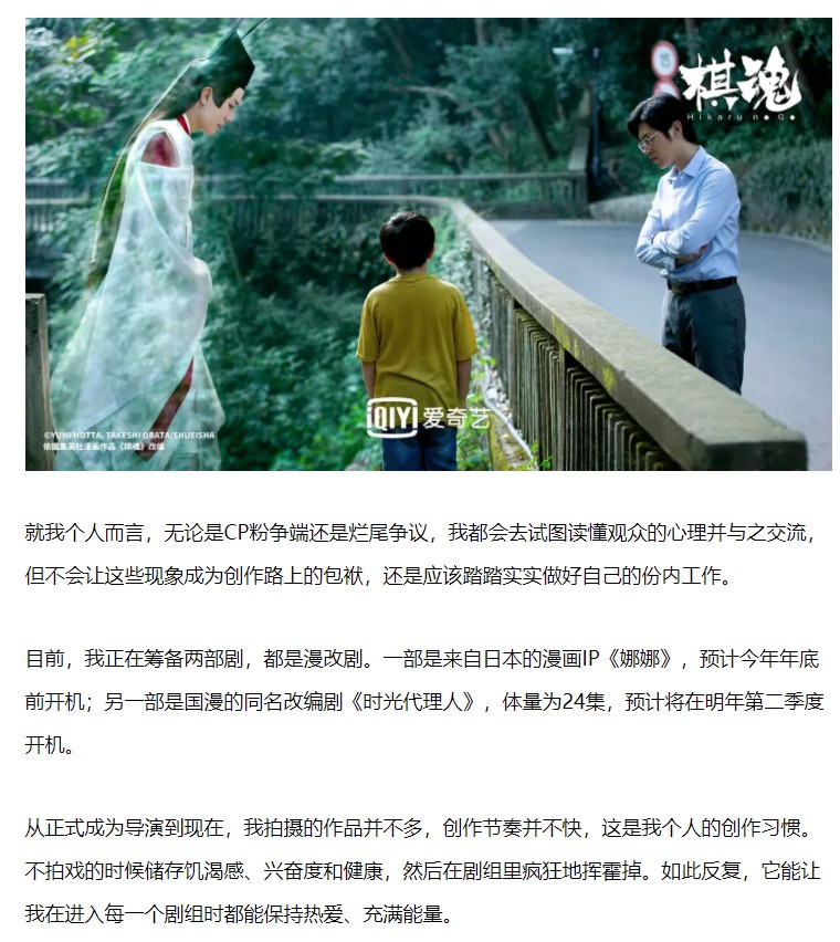 中国ドラマ版ヒカルの碁「棋魂」の刘畅監督が、インタビュー内で今後の予定作品としてドラマ版「時光代理人」全24話の撮影を挙げたらしい。
