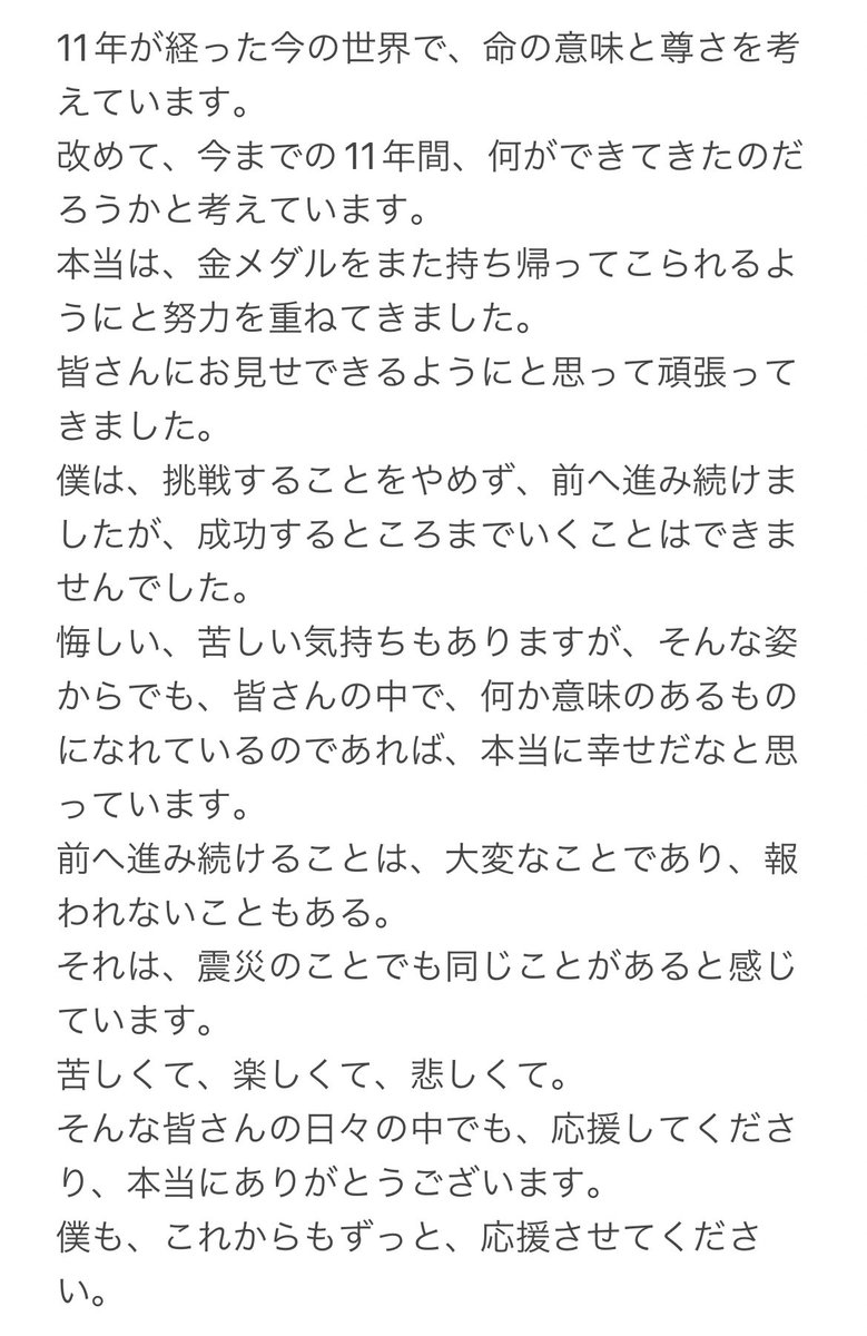 「現役引退とは微塵も感じさせない希望に満ちた素晴らしい会見で、この年齢の私にもまだ次のステージがあると背中を押されました。努力と向上を辞められない真のアスリートなんですね。第一線を退くというのに希望が滲むから全く残念な気持ちになりませんでした。今後の羽生くんも楽しみにしています」