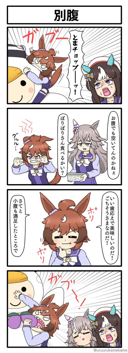 ウインディちゃんととまチョップのほのぼの四コマ漫画です