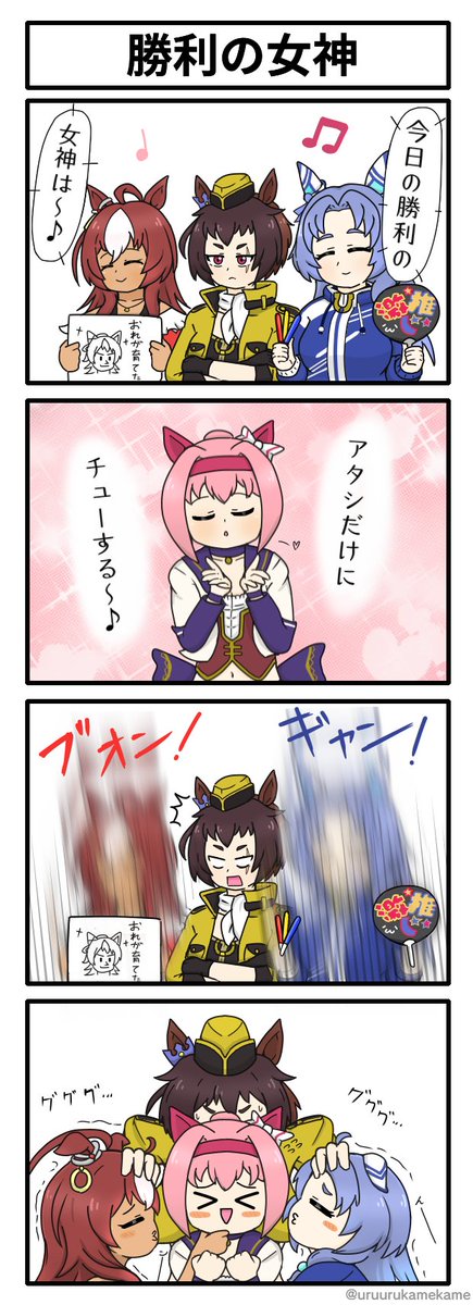ヒシアマゾンがシンコウウインディに噛みつかれる四コマ漫画です。