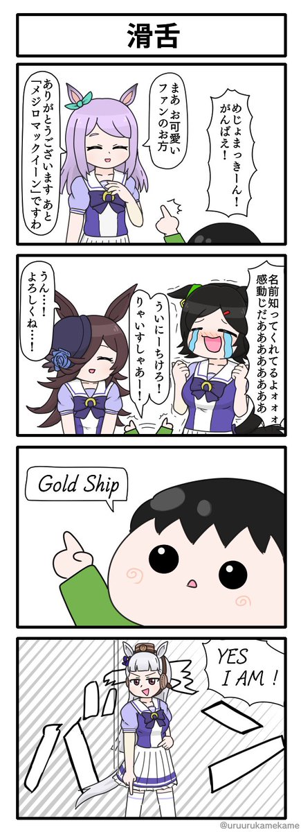 ファンの子どもと出会うめじょまっきーん達の四コマ漫画です