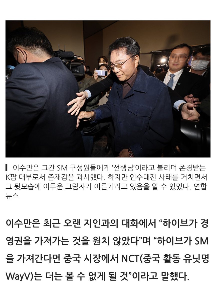 อีซูมานกล่าวว่า “ฉันไม่ต้องการให้ HYBE เข้ามาบริหาร” และ “หาก HYBE เข้ารับตำแหน่ง SM จะไม่มี NCT (ชื่อยูนิตที่ใช้งานในจีน WayV) อีกต่อไปในตลาดจีน”