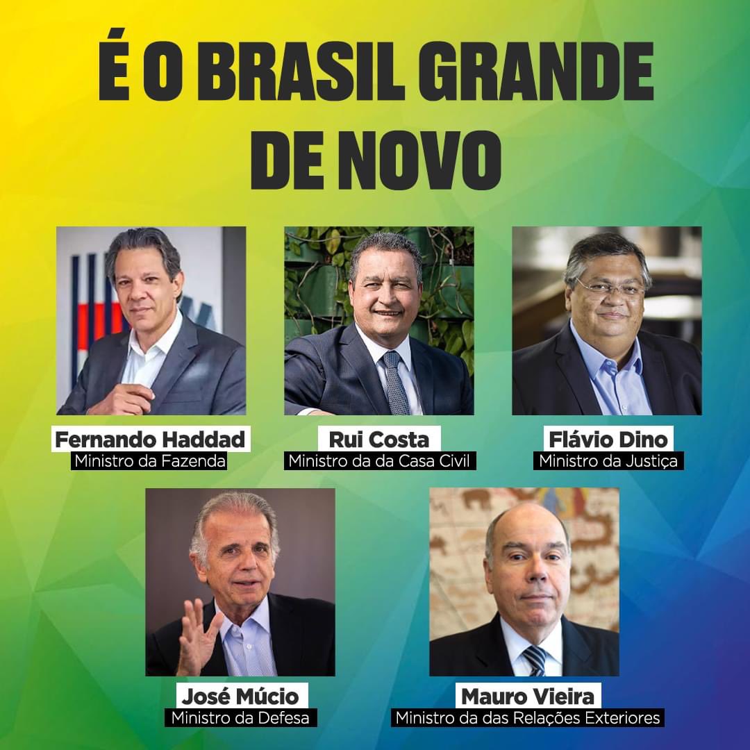 ATENÇÃO! Lula começa a escalar o time que vai fazer o Brasil ser feliz de novo. São eles: Fernando Haddad (Fazenda), Rui Costa (Casa Civil), José Múcio Monteiro (Defesa), Flávio Dino (Justiça) e Mauro Vieira (Relações Exteriores).
