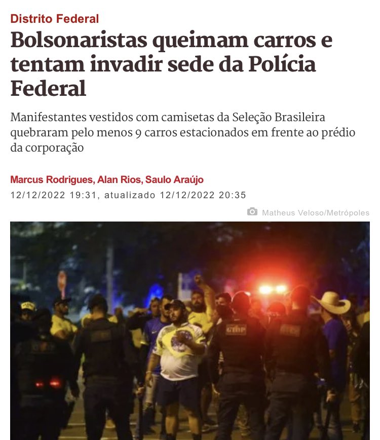 Os atos terroristas que ocorrem, nesta noite, em Brasília, mostram a quantidade de criminosos que há disfarçados de patriotas. Merecem ser combatidos com rigor e responder na justiça pelos crimes praticados.