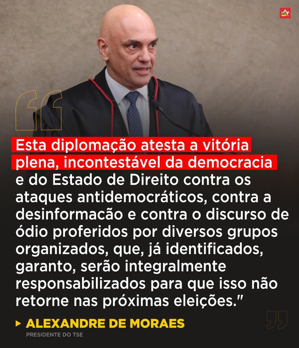 O presidente do TSE, ministro Alexandre de Moraes, mandou um recado. Os que atacam a nossa democracia vão ser punidos 👇