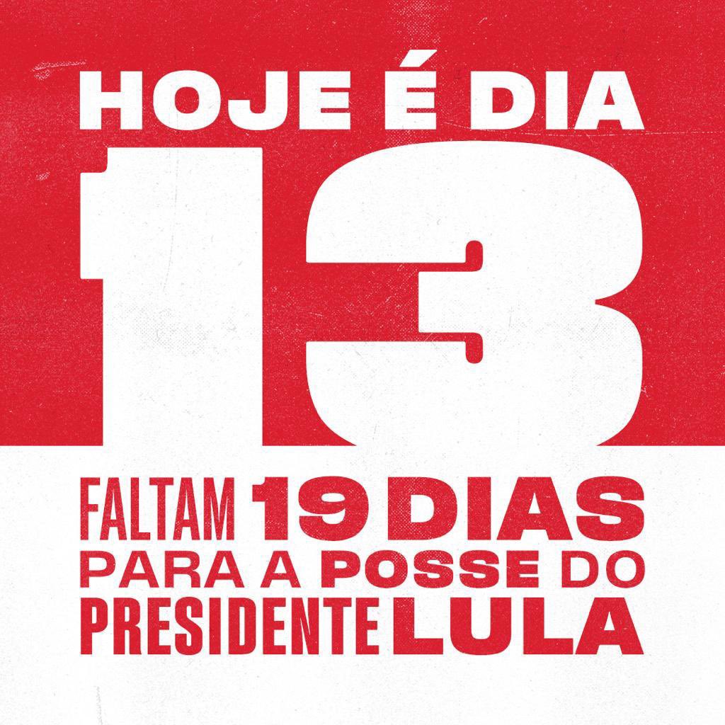 Eles estão desesperados: sabem que o tempo do ódio, da impunidade e do descaso está acabando. A democracia venceu! Hoje é dia 13 e logo menos um novo Brasil vai começar. Faltam 19 dias para a posse de Lula. Bom dia!