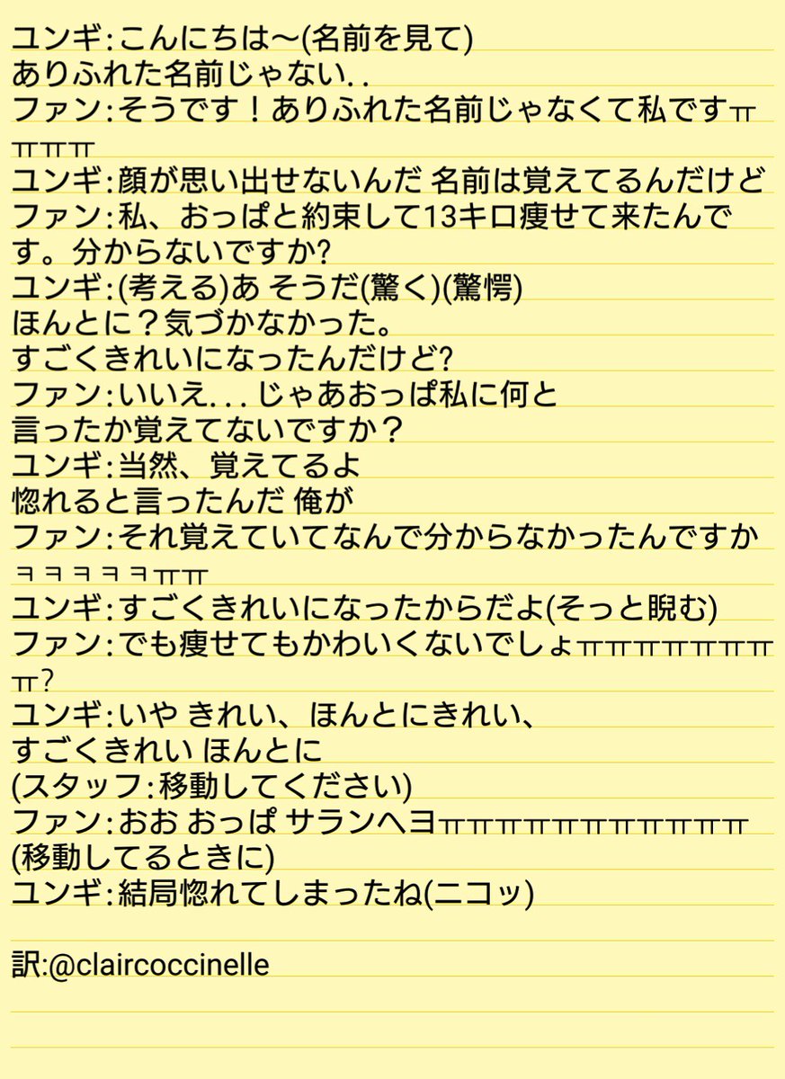 --ユンギ サイン会 レポ-- 題名:ユンギは記憶力がいい ファン:おっぱ私のこと覚えてる? ユンギ:??来たことないじゃん (ツンツン)