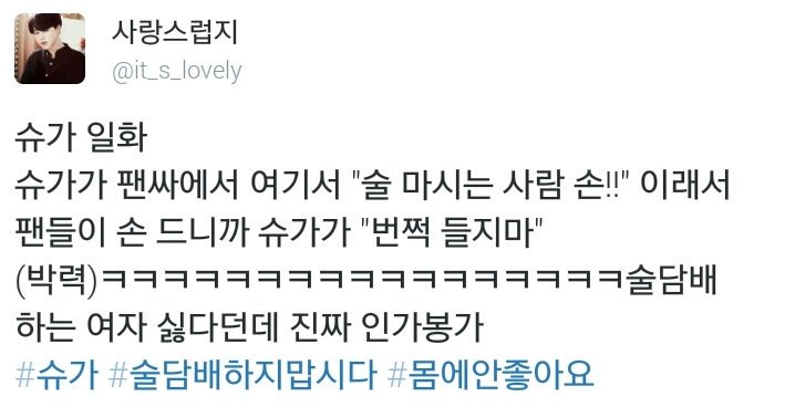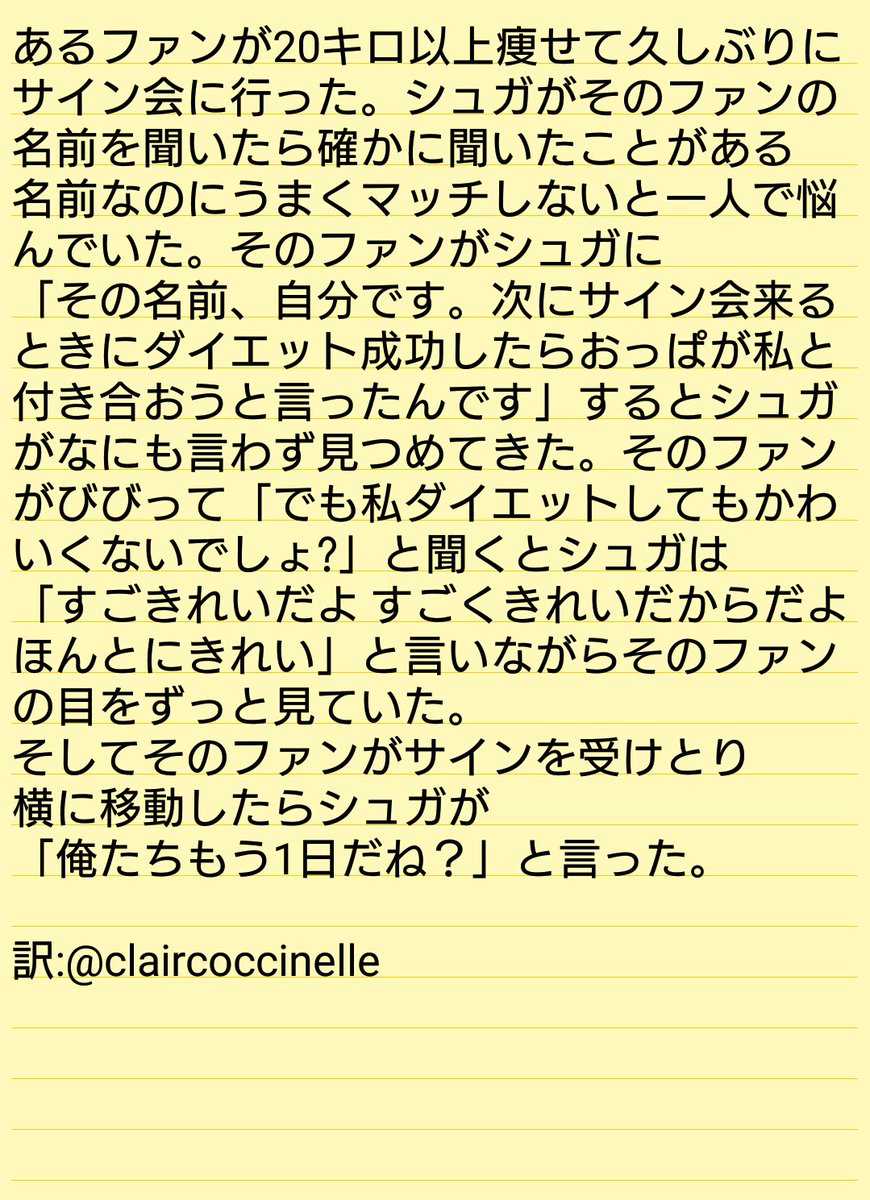 --ユンギ サイン会 訳-- 学校を早退したいときの理由を書いてほしいとファンがユンギに頼んだら →「ユンギがすごく素敵で心臓に負担がかかります。入院しないとです。」