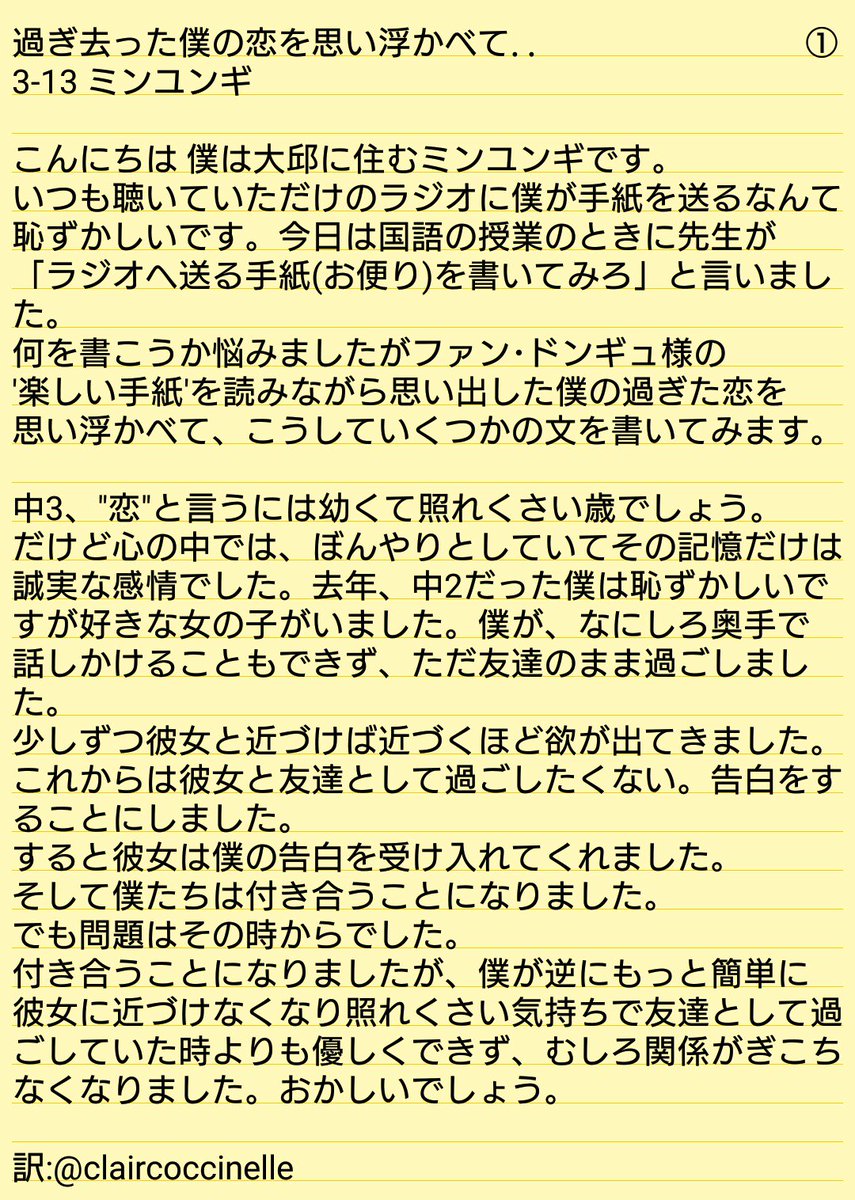 ユンギが中3の時に書かれた手紙?(お便り)を訳しました。訳しづらい文もあったので大目に見てください🙇