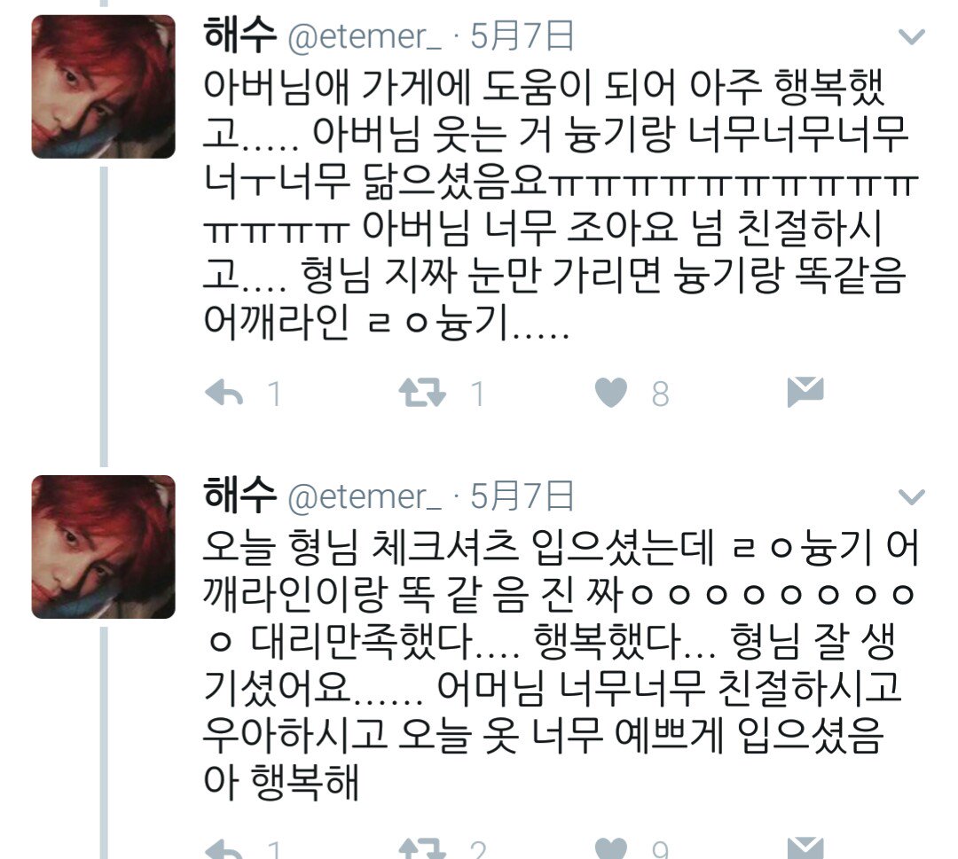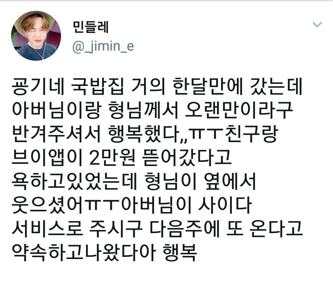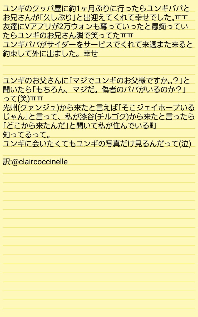 --ミン家 エピソード-- お母さん笑ったときユンギそっくりで、えんえんㅠㅠㅠㅠ お父さんが早く家帰れ(夜遅いから)と言ってその後コンビニで再び会って、また「早く家帰れ 怒られるぞ」と言いましたwwwww そして美味しかった