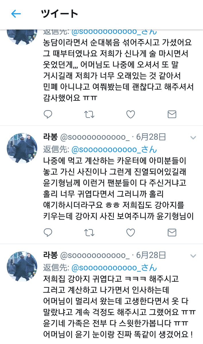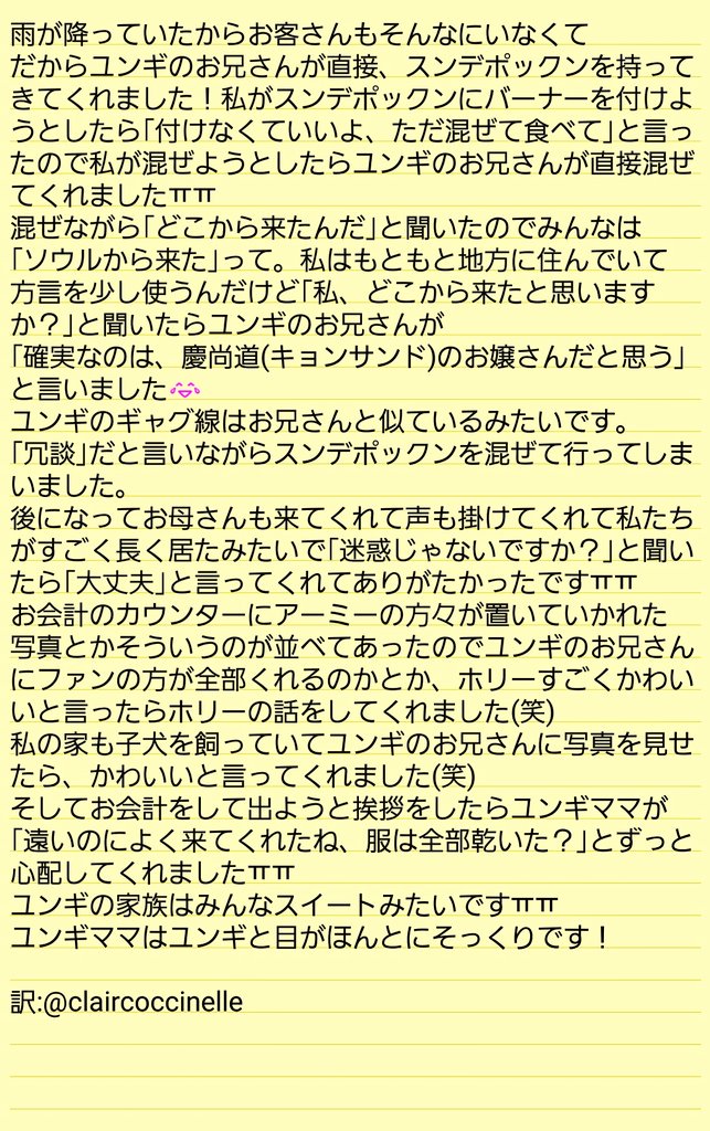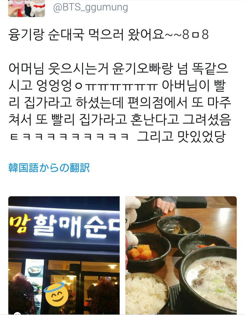 ユンギのご両親のクッパ屋が29日に店主が変わるそうです😭 ご両親の健康状態の問題でクッパ屋をやめてソウルに引っ越すみたいです。。。。29日以降は、ばんたん関連の写真などを全て取り除くらしいです......たった今、ちょっと前に行ってユンギのお兄さんから直接聞いた話です。ㅠㅠ