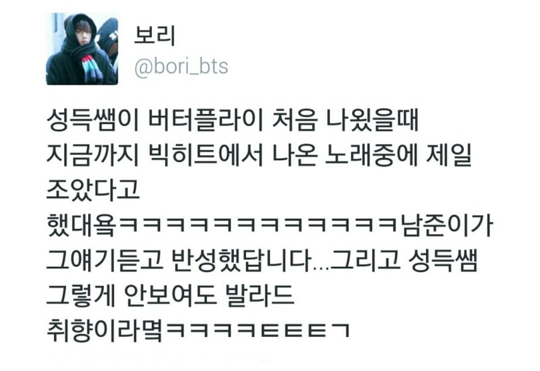 --サイン会 エピソード-- ソンドゥク先生が「Butterflyが初めて出たとき今までBigHitで出てきた曲のなかでいっちばん良かった」って(笑)ナムジュンがその話を聞いて反省したらしいです...そしてソンドゥク先生は、そうは見えないけどバラードが好みらしい😌