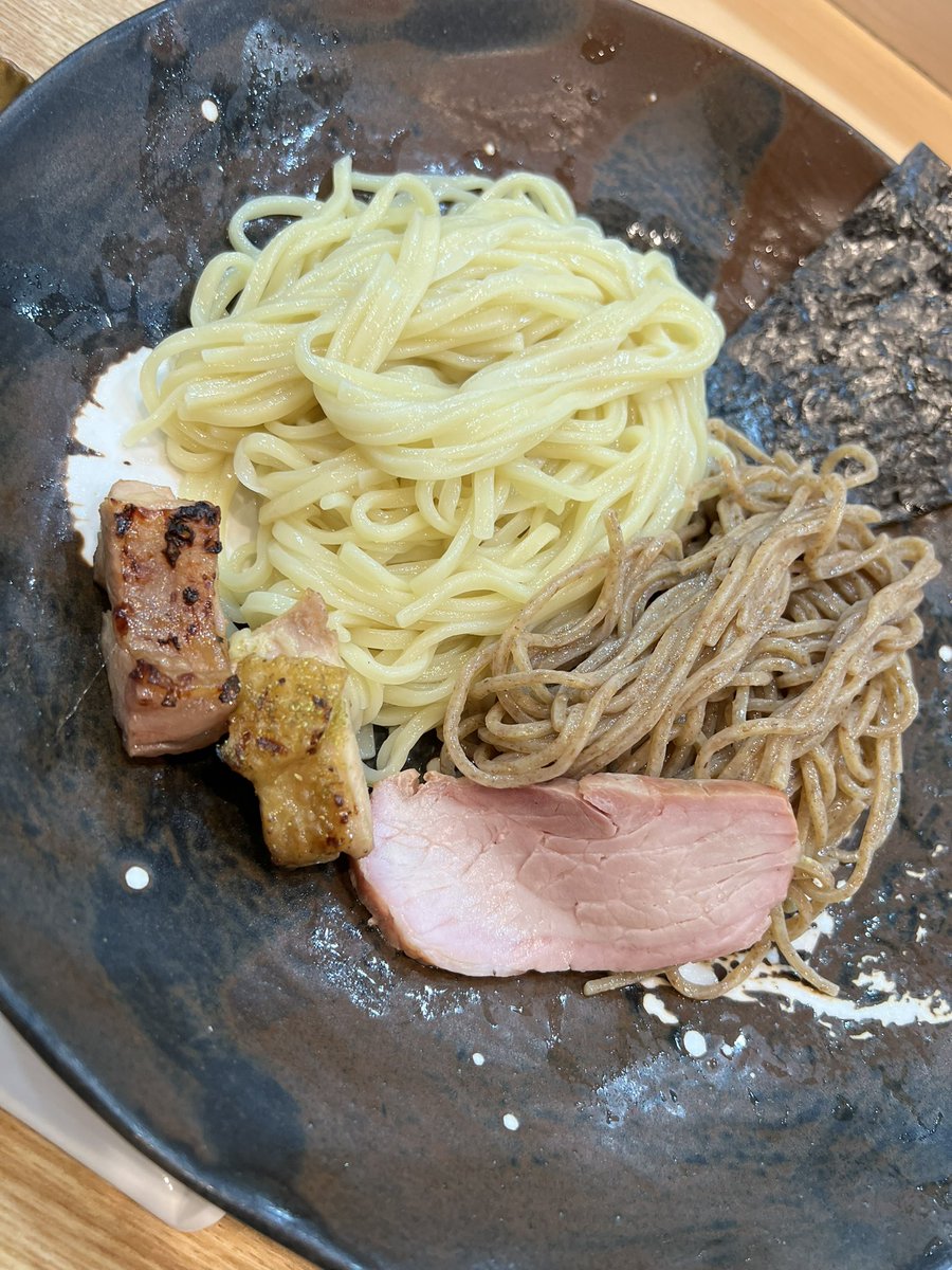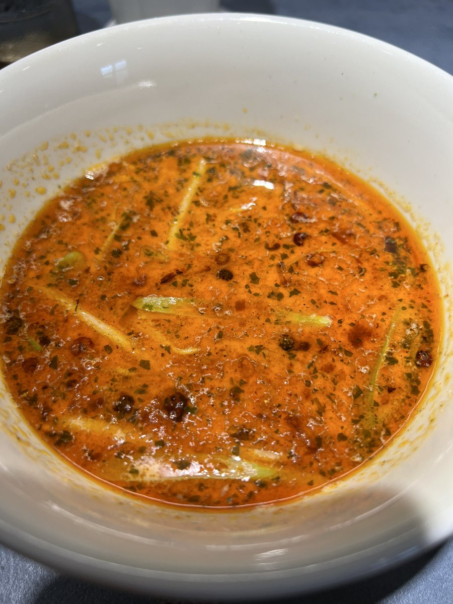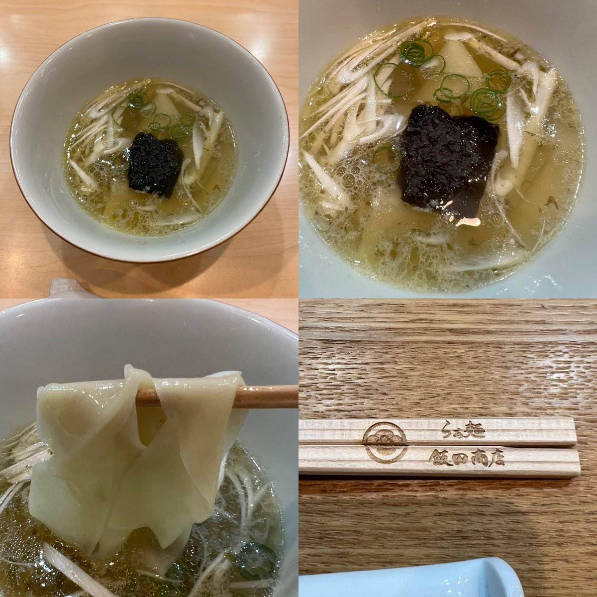 飯田商店🍜湯河原 つけ麺(しお) お出汁割り(にぼし) 2杯目は未食のつけ麺しお✨ 麺をそのまま&薬味で食べて次は冷たいつけ汁で頂き麺が凄い美味しい😋 つけ汁は鶏油たっぷりだけどあっさりで美味しかった〜🤤 今日のお出汁割りは超幅広麺でびっくり😆 マシャさん今日も御一緒アザますでした🙏