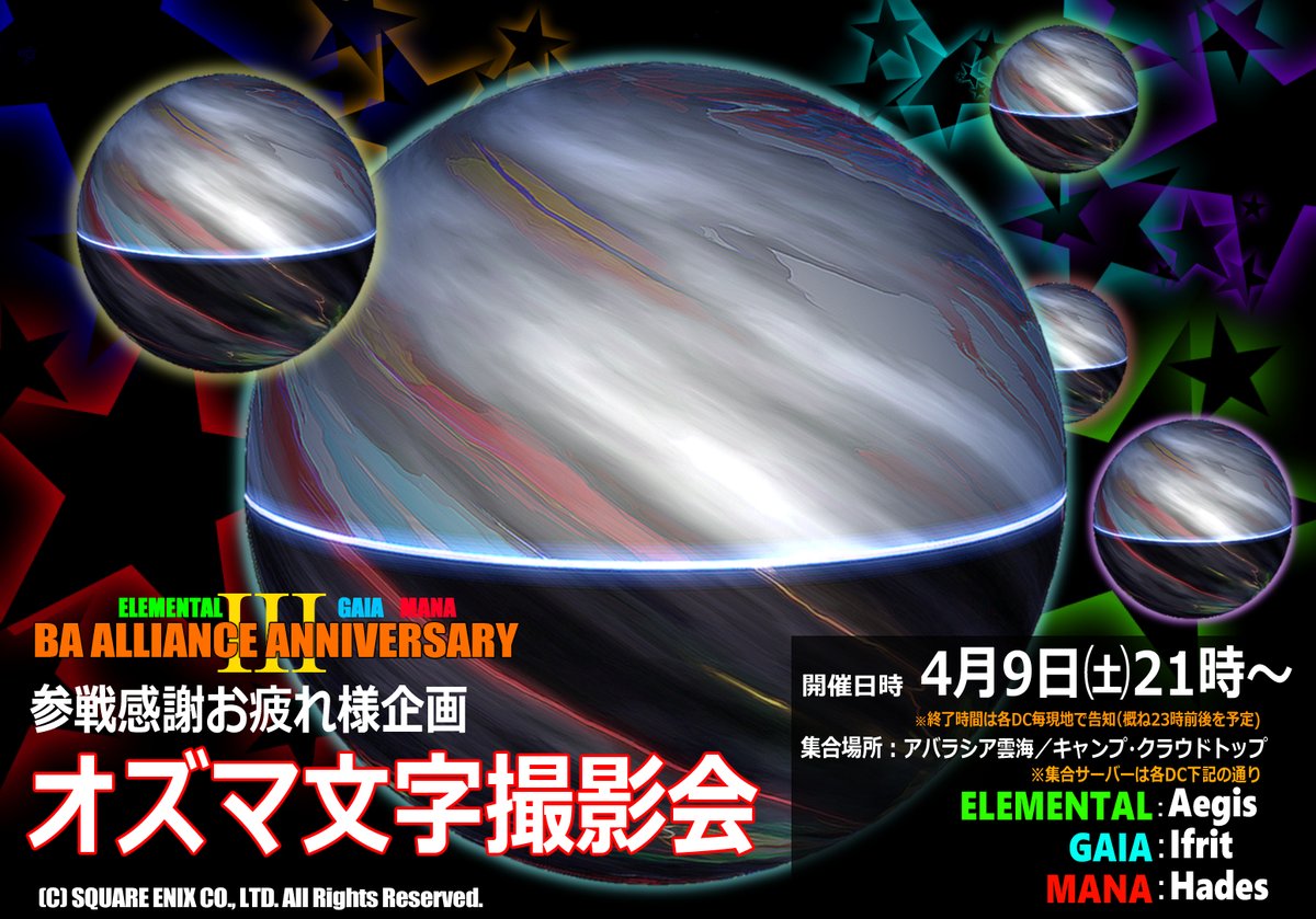 【臨時告知】3月上旬から4/2迄に至る約一ヶ月に及んだ #BA三周年 3DC合同エウレカ/BA攻略期間中の皆様の参戦ご協力に対する感謝慰労を目的とした特別企画🌐《オズマ文字撮影会》🌐を4/9㈯21時より合同開催!駆け抜けたエウレカ戦士達の参加を待ってます!詳細は画像URL参照✅
