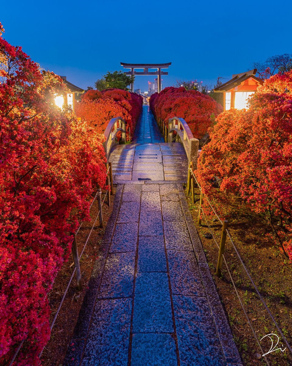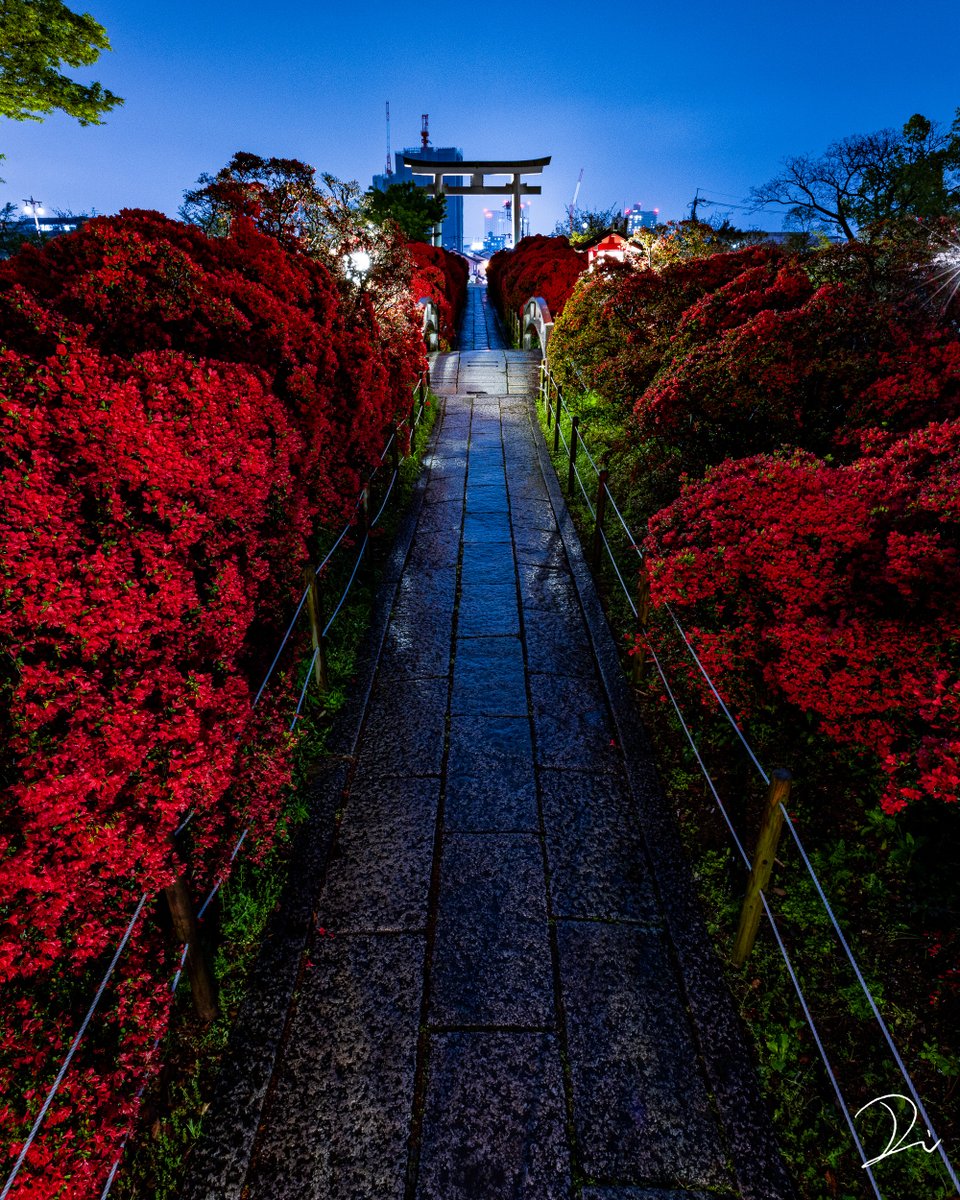 赤く染まる霧島躑躅の参道と、荘厳なる鳥居。 その先に浮かび上がる摩天楼が、ニンジャの跋扈するサイバーパンク世界のような雰囲気だった。