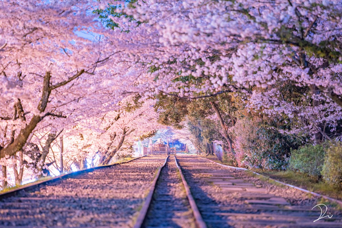 桃源郷へ続いているかのような、幻想的な桜の線路。