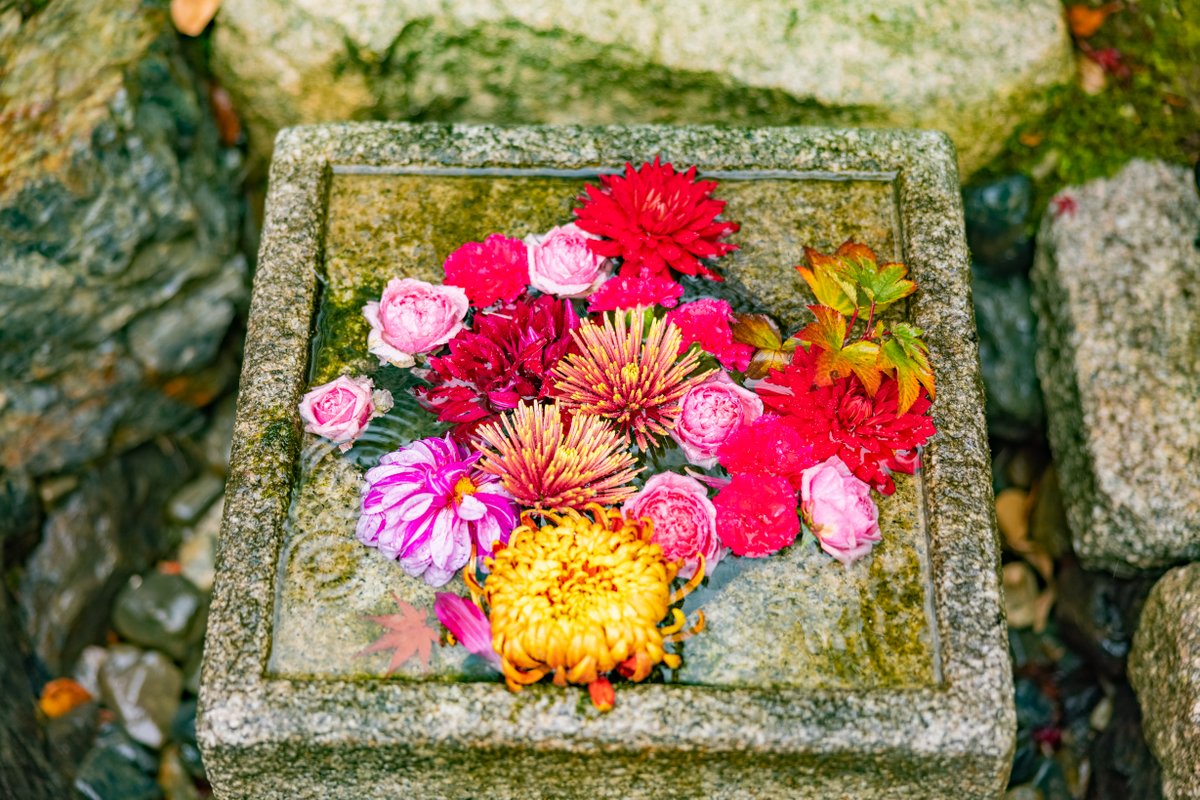 手水鉢の水に浸かる緑から赤のグラデーション紅葉。 「浮かぶ」ではなく、水の中に「沈んだ」状態の なないろ手水をずっと撮りたかった。 水の中に完全に入ることで氷やゼリーのような透明の中に捕われたような美しさを見せてくれるのです。