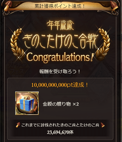 「きのこたけのこ合戦」最大報酬の累計100億Ptまで達成!