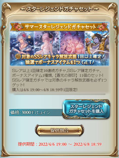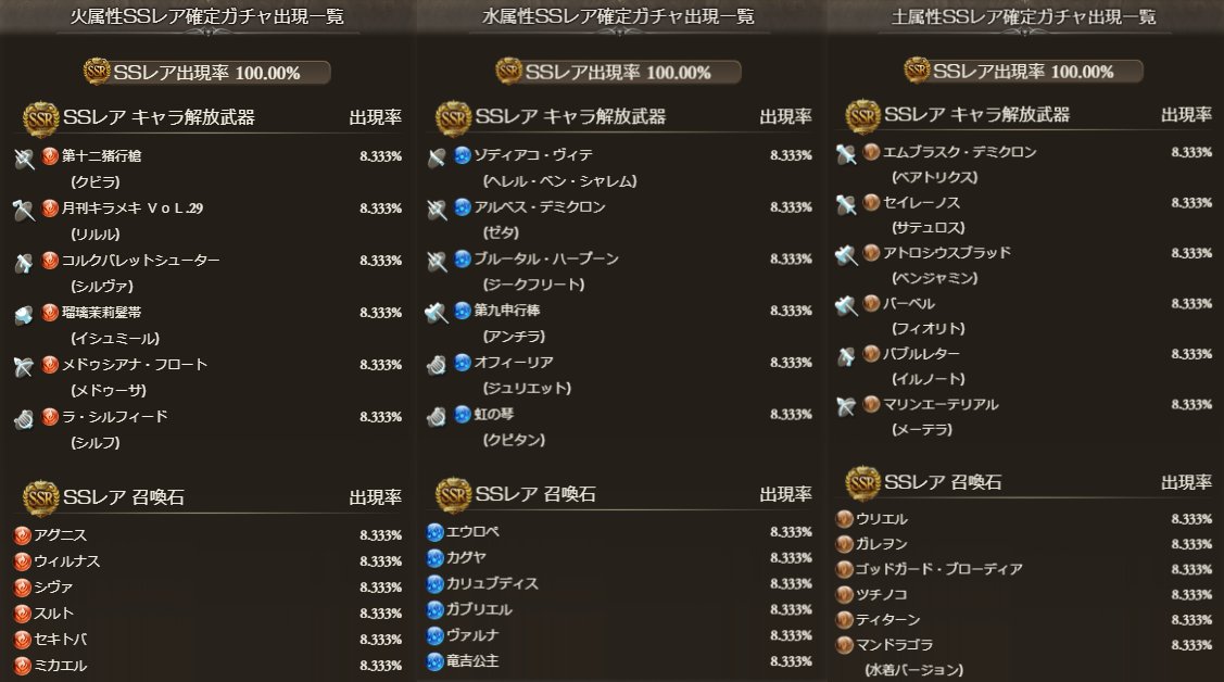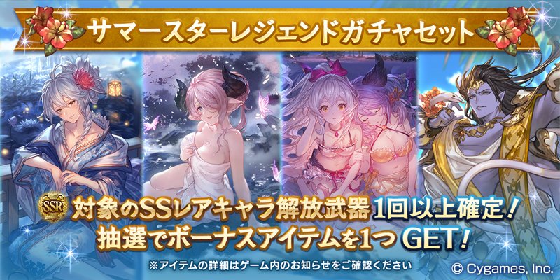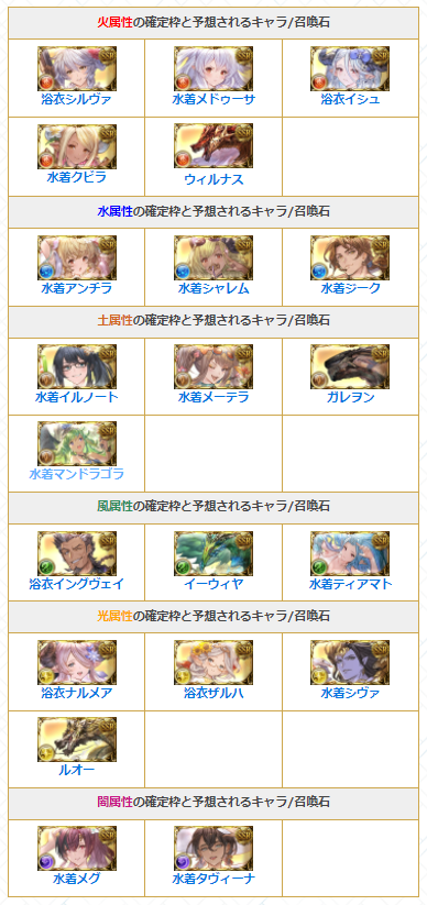 開催期間の長さから、今回は確定枠に水着キャラ/召喚石や六竜石が含まれる属性別スタレと予想されます