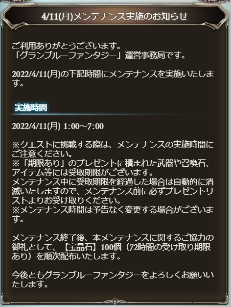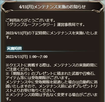 ゲーム内に4/11(月)1:00~7:00 メンテナンス実施のお知らせが出ています!
