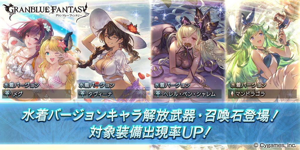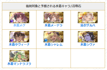 告知画像から「水着メグ」「水着タヴィーナ」「水着シャレム」「水着マンドラゴラ(召喚石)」の復刻登場が判明!